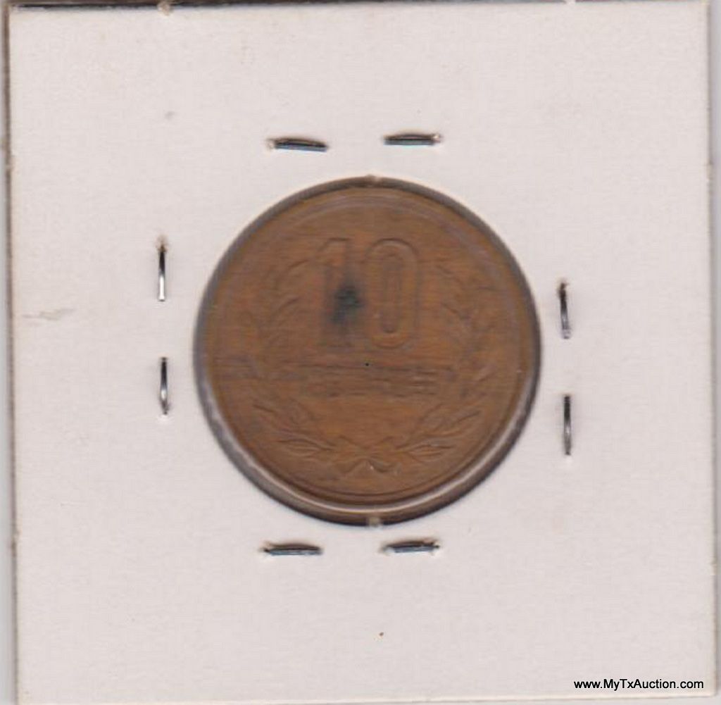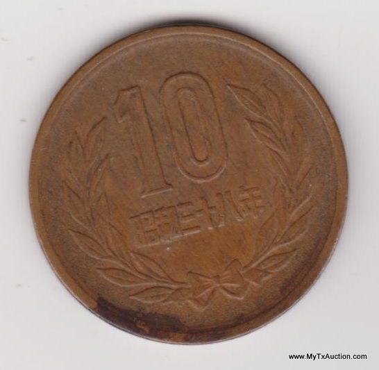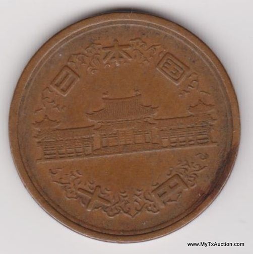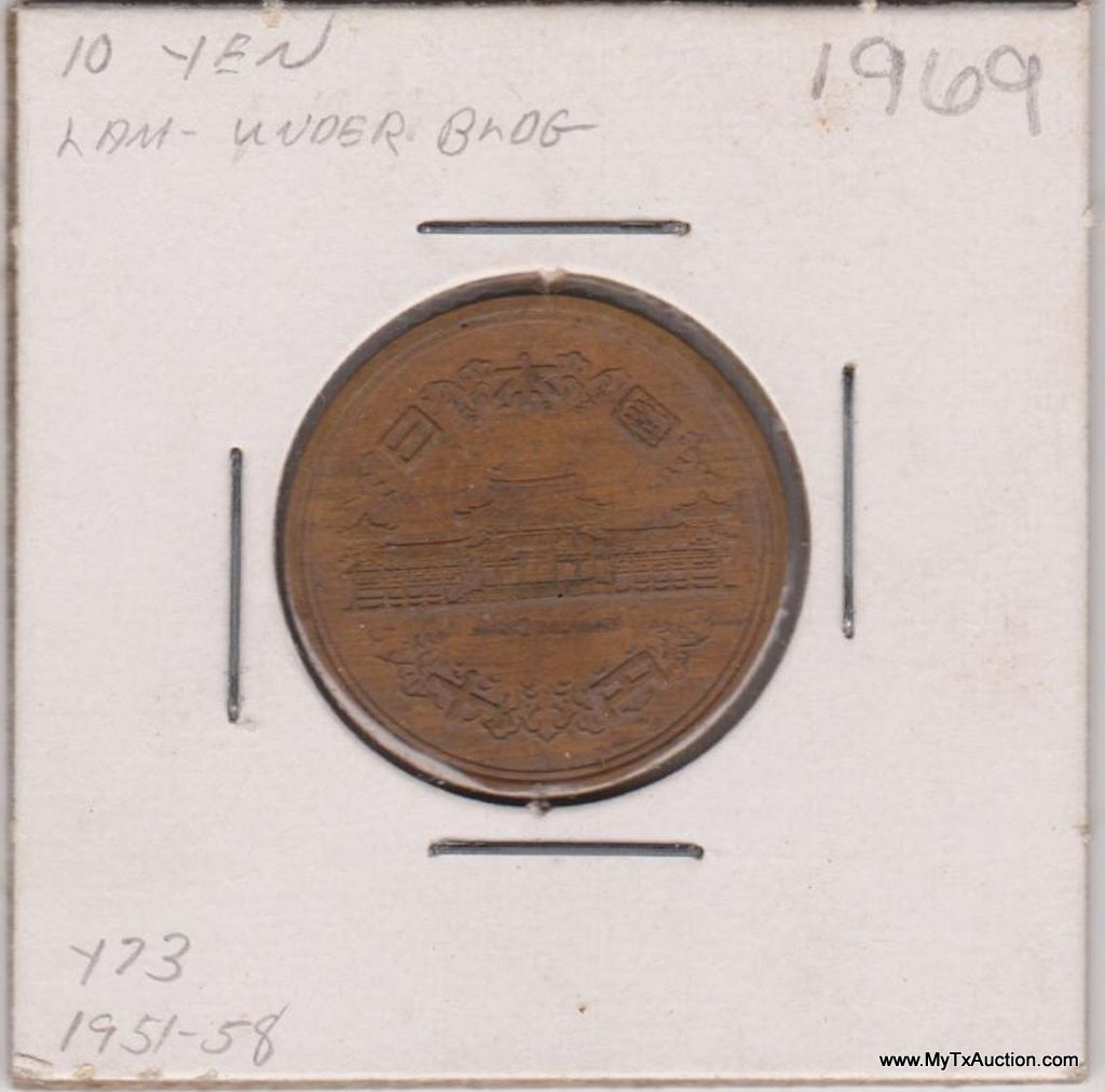 2 - 1963 & 1969 10 Yen - Showa Smooth edge (Japanese - Showa era) Country:Japan - Coin Mint Years:34-64 (1959-1989) - Metal:Bronze - Weight:4.5g - Diameter:23.5mm -Thickness:1.5mm - Design Obverse:Temple in center with authority on top and value below Lettering:? ? ? ? ? - Reverse:Value and denomination within wreath Lettering:10 ?????? - Engravers:Unknown - Shape:Round - Edge:Smooth