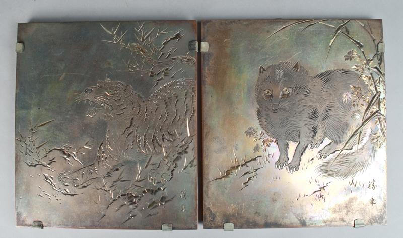 Heavy metaled plates finely carved, one to depict a fierce tiger amongst foliage, the other to depict a fox. Both signed with two character marks in LR, both mounted on wood plaques with wood hangers. 8.125" x 7.25" W, circa late 19th/early 20th century.