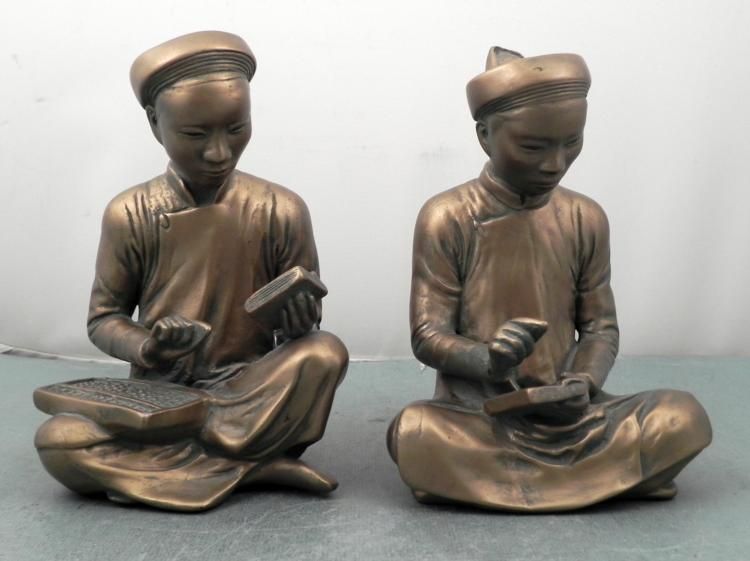 These two metal figural sculptures appear to be two Japanese monks, possible scribes. One is holding a book, and the other a book and abacus. Each is a brass tone metal, seemingly hollow, and in excellent condition. They are 8 1/2 inches tall. * * * These will be great for a library, reading room, or anyplace you have traditional decor.