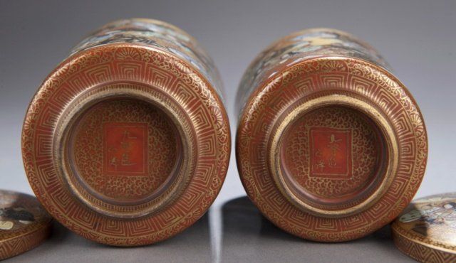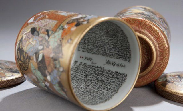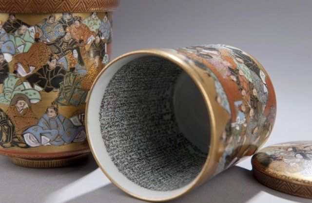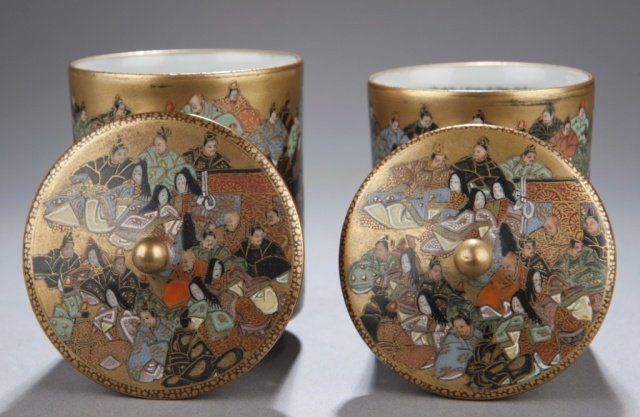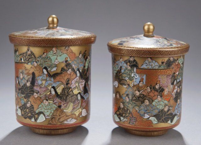 Pair of Japanese "Thousand Faces" covered cups. Early 20th century. With dense calligraphic inscription encircling the interior. 3 1/4"h.
