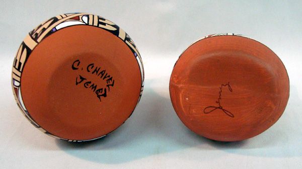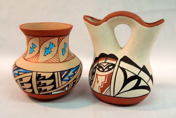 2 Jemez Pieces, Jar by C. Jemez & Wedding Vase. The jar is polychrome in color and measures approx. 5''H x 5 3/4''W, wedding vase measures approx. 5 1/2''H x 4 1/2''W.