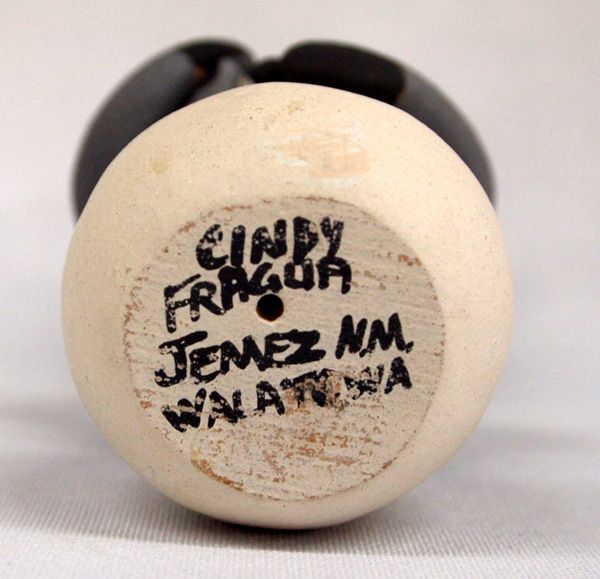 2 Jemez Pottery Figures - Fragua and ALMA (Alma Concha Loretto Maestas - Award winning storyteller artist). Here's an unusual figure - a snowman with cowboy hat and Native American shawl. The hat has a small chip on the edge. It is signed on the bottom, ''Cindy Fragua Jemez, NM.'' The other figure is signed ''AIMA.'' It's right arm has been repaired (glued at the wrist.) They are 5''H x 2''W.
