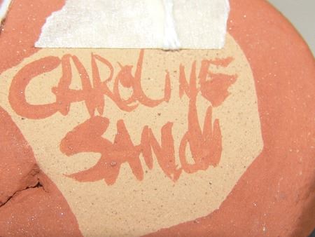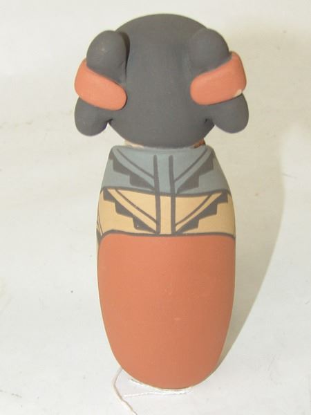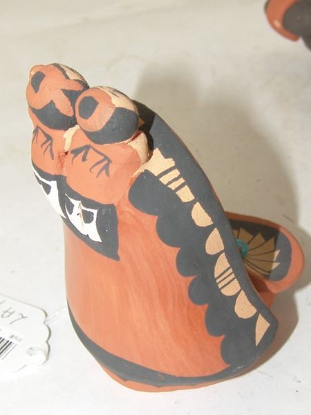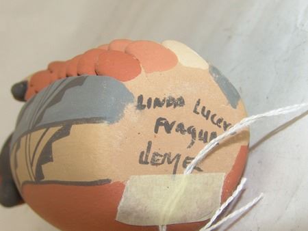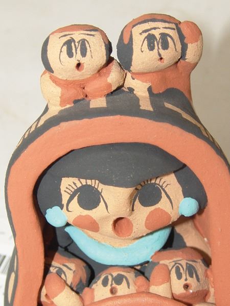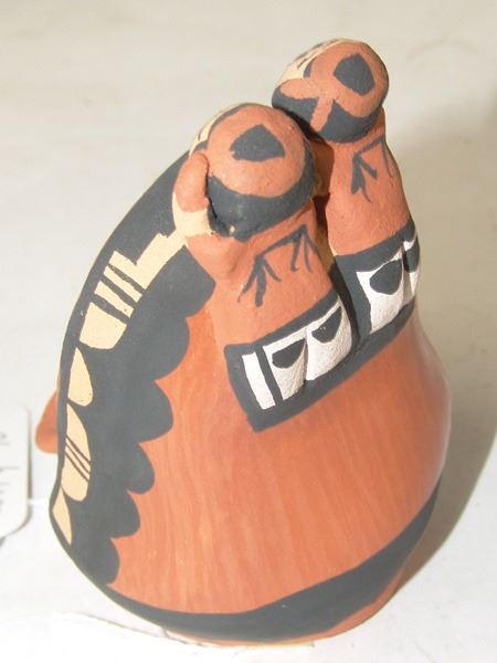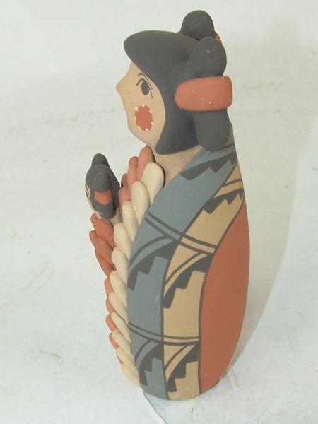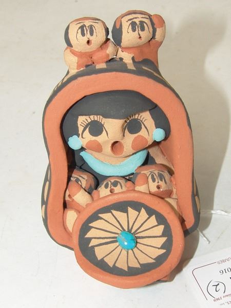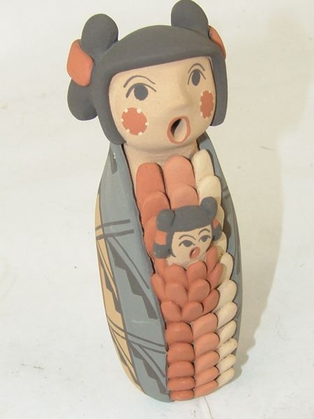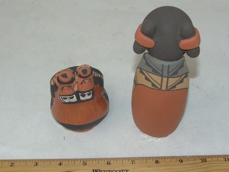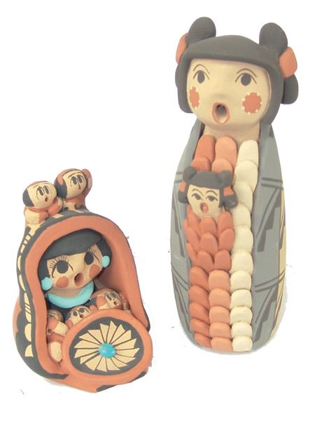 Early 2000s, A tall corn woman figure shown holding a child by Linda Lucero Fragua, plus a smaller, more traditional storyteller by Caroline Sandia. Very good condition. Largest 6-1/2" x 2-1/4" x 2-3/4"