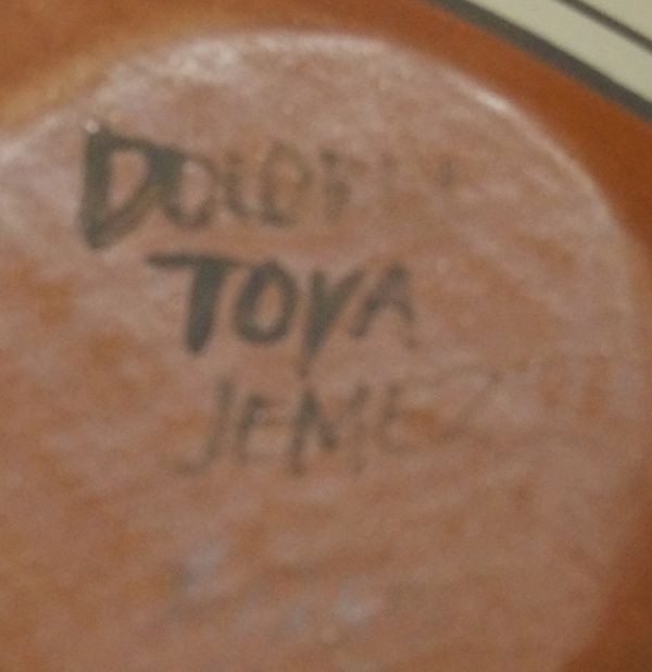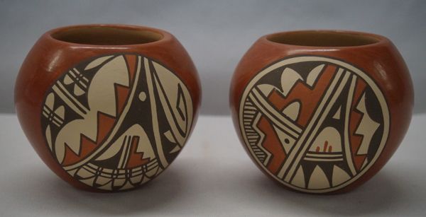 2 Jemez Pottery Jars by Dolores Toya, measures 4'' x 4'', beautiful terra cotta base with abstract and geometric designs, both are signed on bottom of jars