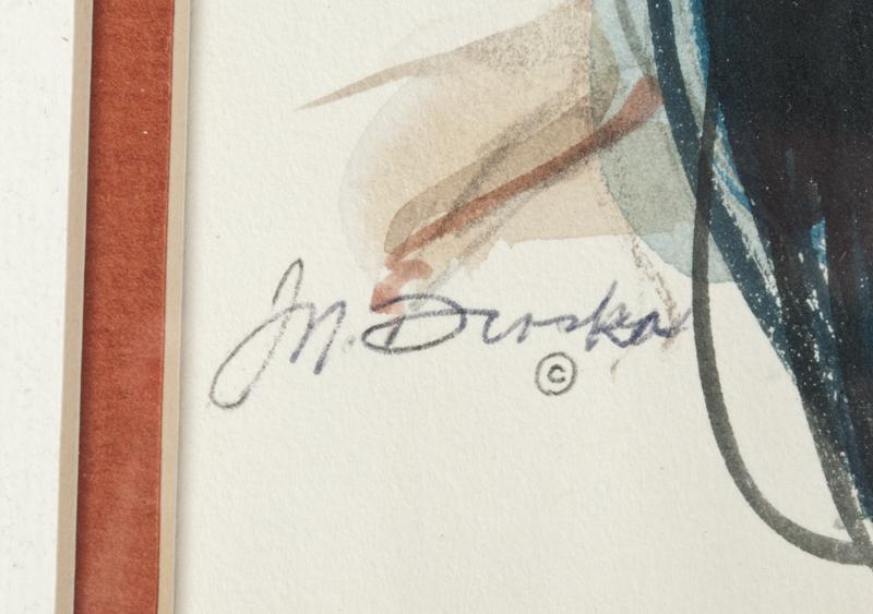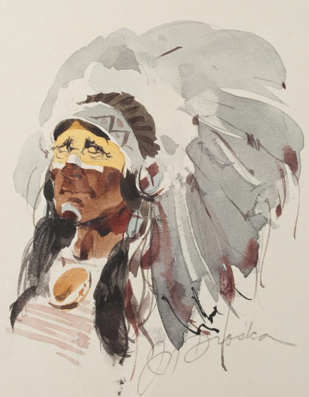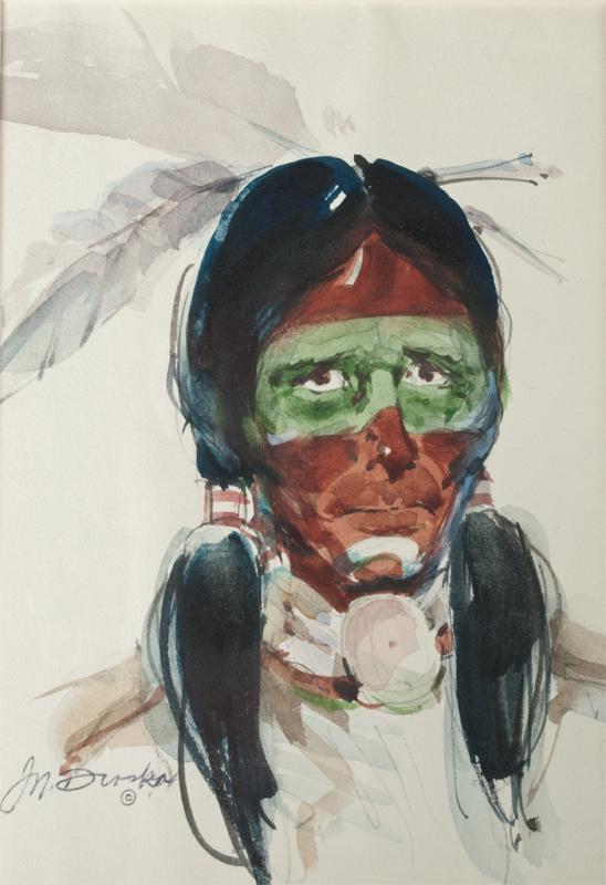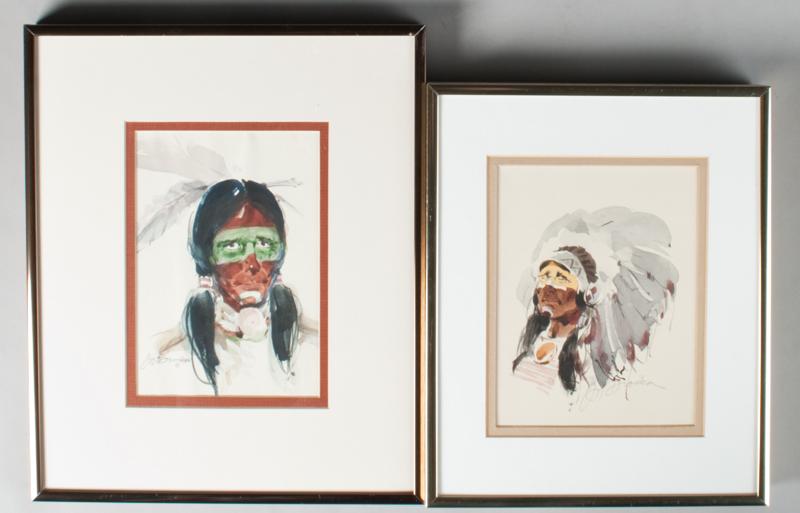 John Droska, 1920-2005, American. Resided in Georgia and California. Studied under Robert Wood, Rex Brandt, Howard Brodie and Tony Couch. Includes a painting depicting a Native American with green painted eyes, 6.5" H x 4.5" W (sight) with 2.75" for matting and frame, signed LR. Together with a painting depicting a Native American Chief in headress, 6.25" H x 4.75" W (sight) with 2" for matting and frame, pencil signed LR.