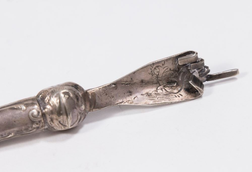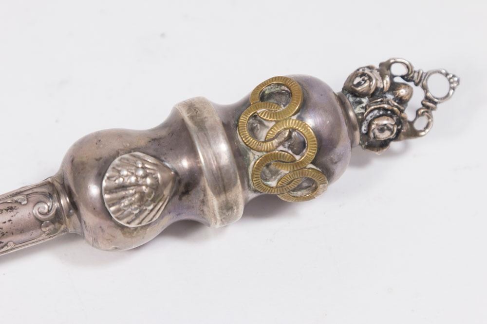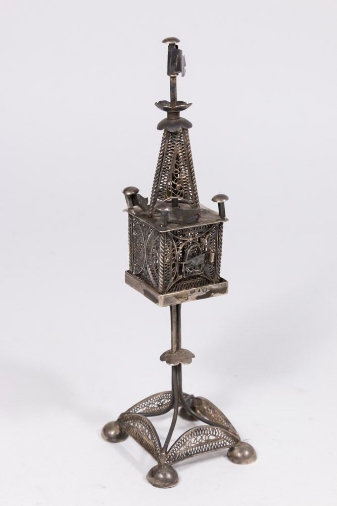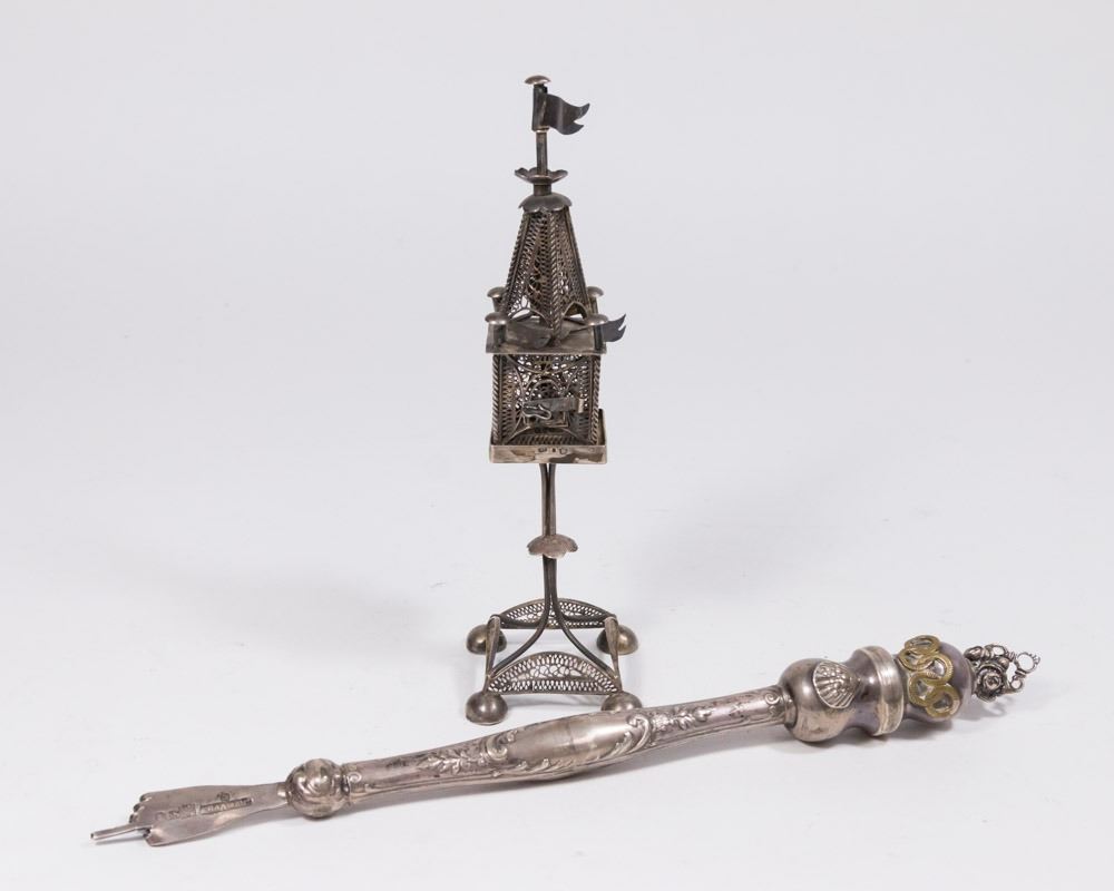Including 2-19th century silver pieces, Austro-Hungarian spice box, approx. 8" H and handmade Torah pointer (Yad) Russian stamped 84 with maker's name - Snadman, approx. 12" L, dated 1874.