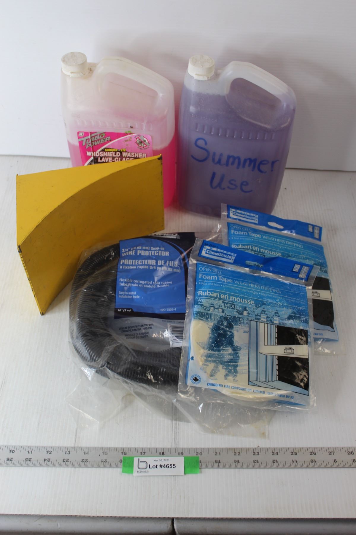 (2) Jugs Windshield Fluid, Wheel Chock, Weatherstripping, Wire Protector
