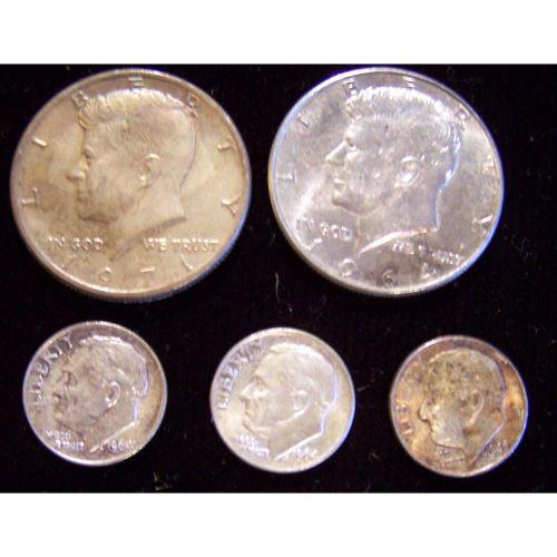 2 KENNEDY HALVES 1971 & 1964 AND 3 SILVER ROOSEVELT DIMES