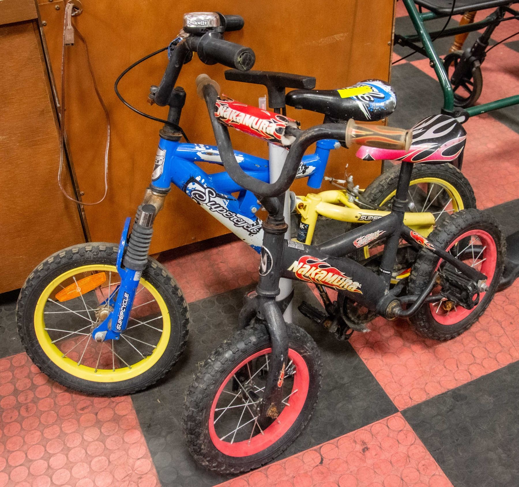 2 KIDS BIKES + TIRE PUMP (MISSING FOOT HOLDER)