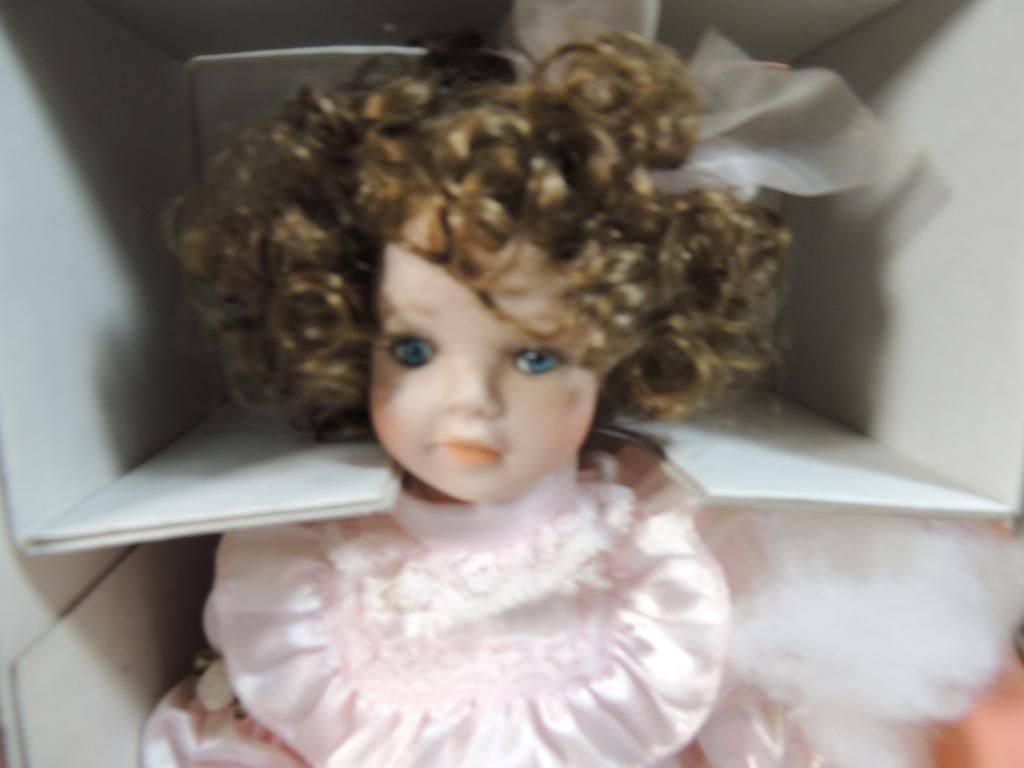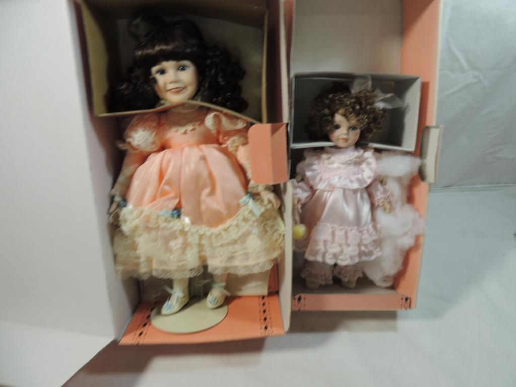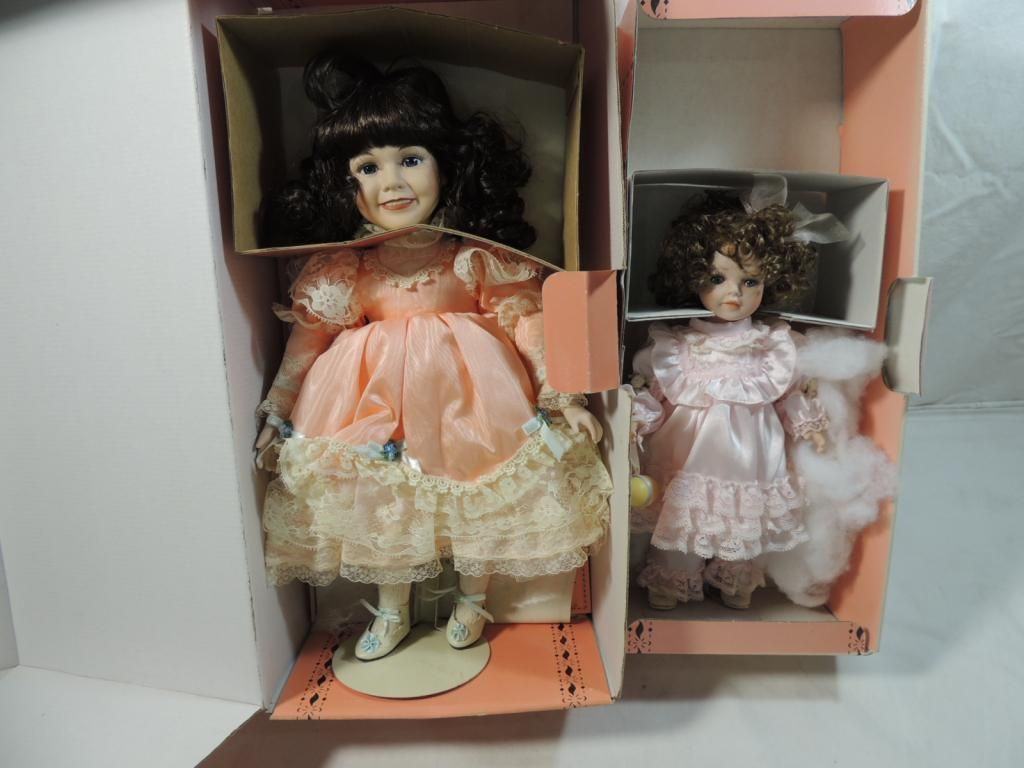 KINGSTATE THE DOLLCRAFTER DOLLS. SMALL EASTER DOLL. DOLL IN PEACH DRESS. BOTH IN ORIGINAL BOXES AND IN GREAT CONDITION. AS SHOWN. SEE PHOTO FOR MORE DETAILS.
