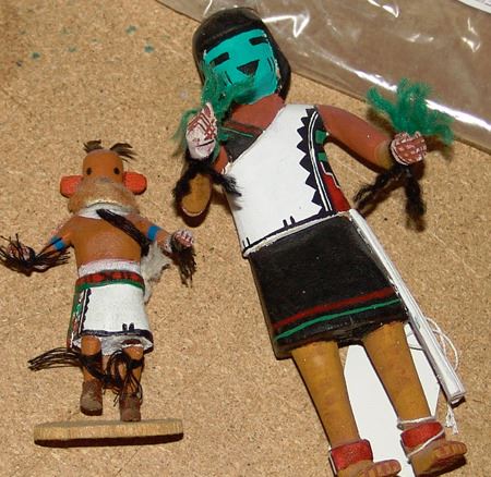 Mid/Late 1900s, Two hand carved Hopi kachina dolls, one with broken leg, one with broken arm. Larger 5-1/2" x 3"