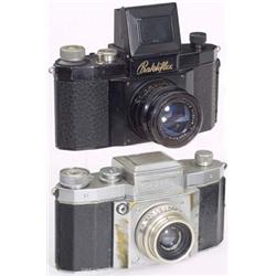 Kamera-Werkstätten, Dresden: 1) "Praktiflex", ca. 1940, Nr. 11.300, M-40-Gewindeanschluß, schwarz. Mit schwarzem Zeiss "Biotar 2/5,8 cm", Nr. 3.340.276, vergütetes Nachkriegsobjektiv, Nachlackierungen an der Kamera-Deckkappe, (3-/3+). - Und: 2) "Praktiflex", ca. 1947, Nr. 63.562, M 40, Auslöser vorne, Tessar 3,5/5 cm, (3-/3). - 2 Praktiflex cameras with M 40 mount! - € 200/250 - (126/9)