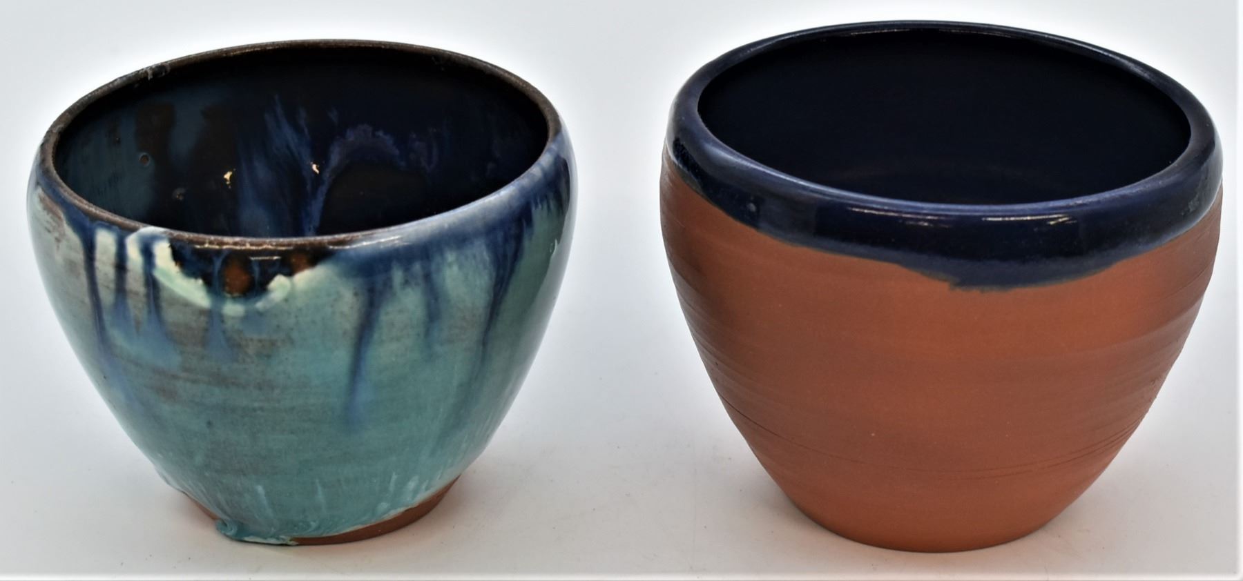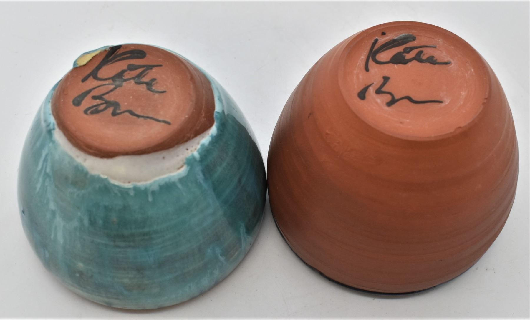 2 Kate Brown Pottery Bowls, measure 3.5'' x 4'', both are signed on the bottom, FYI: ''Kate Brown has worked as a potter for all her adult life. Her first touch of clay at age 19 assured her this was the substance her hands were waiting for. Her formative apprenticeship at Jugtown Pottery in Seagrove, North Carolina in the early 1970s set her goal to work as a rural potter. She still draws inspiration from earthenware traditions: the Anglo-American potters of the former British colonies, and that of the Mexican-American borderlands, where she has made her home for the past 25 years. In 1983 she established her studio Kate Brown Pottery in its present location in Southwest New Mexico. She added tile to her production in 1994. Kate has become a master of slip-decorated, clear-glazed terra cotta ware. She is currently experimenting with glaze color and texture over her slips. She says, ''I love clay and working with clay slips. I mix them from my own recipe and I enjoy their creamy sensual texture. They are painterly and they move like clay.'' Over the years, she has made thousands of pots.''