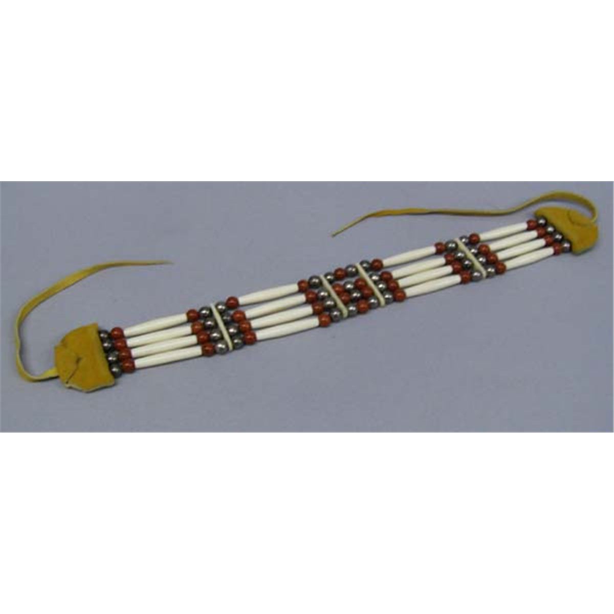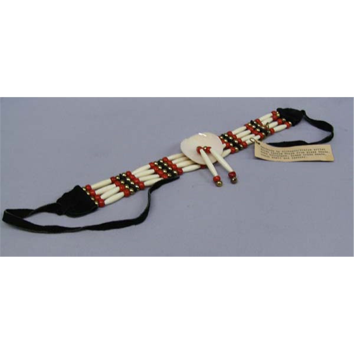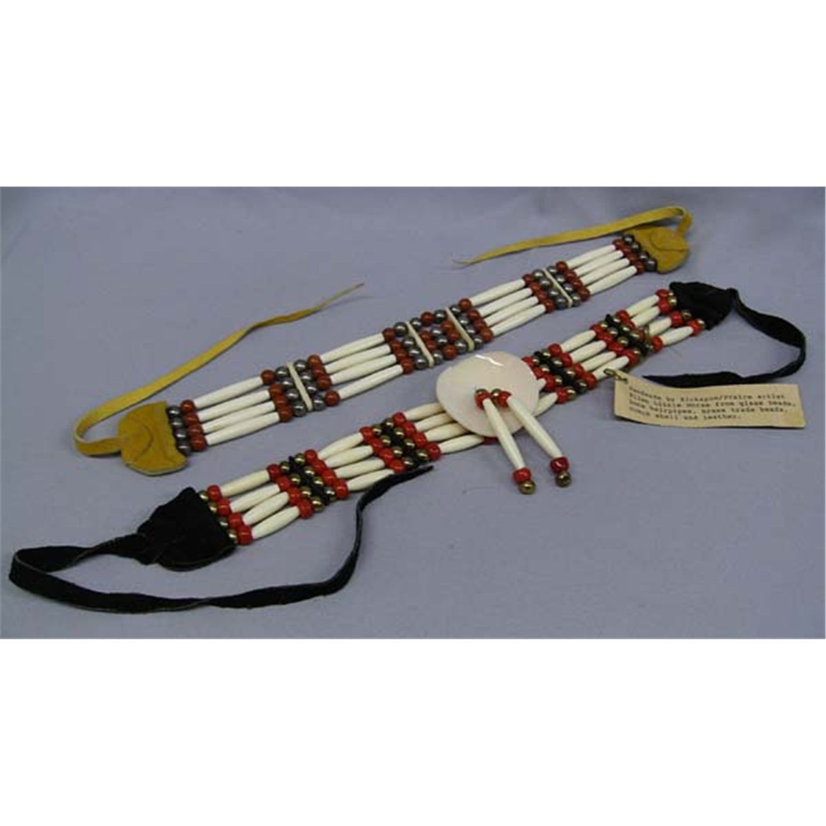 2 Kickapoo Handmade Chokers by Ellen Little Horse. Longest measures approx. 14''L x 1 1/2''W, conch shell measures approx. 2'' diameter. Tag reads: ''Handmade by Kickapoo/Prairie artist Ellen Little Horse from glass beads, bone hairpipes, brass trade beads, conch shell and leather''. Buyers Pay Actual Shipping and Handling Charges(see terms and conditions for more information).