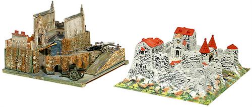 2 Ritterburgen mit Kanonen 1) "Elastolin"-Burg, Zugbrücke mit Handkurbel, Maße 62 x 42 x 22 cm. - 2) Kanone aus Eisenguß, Italien, Länge 14 cm. - 3) Blechkanone, Deutschland, vermutlich "Elastolin", ohne Feder, Länge 14 cm. - Und: 4) Holzburg mit Zugbrücke, um 1920, Maße 45 x 41 x 28 cm.