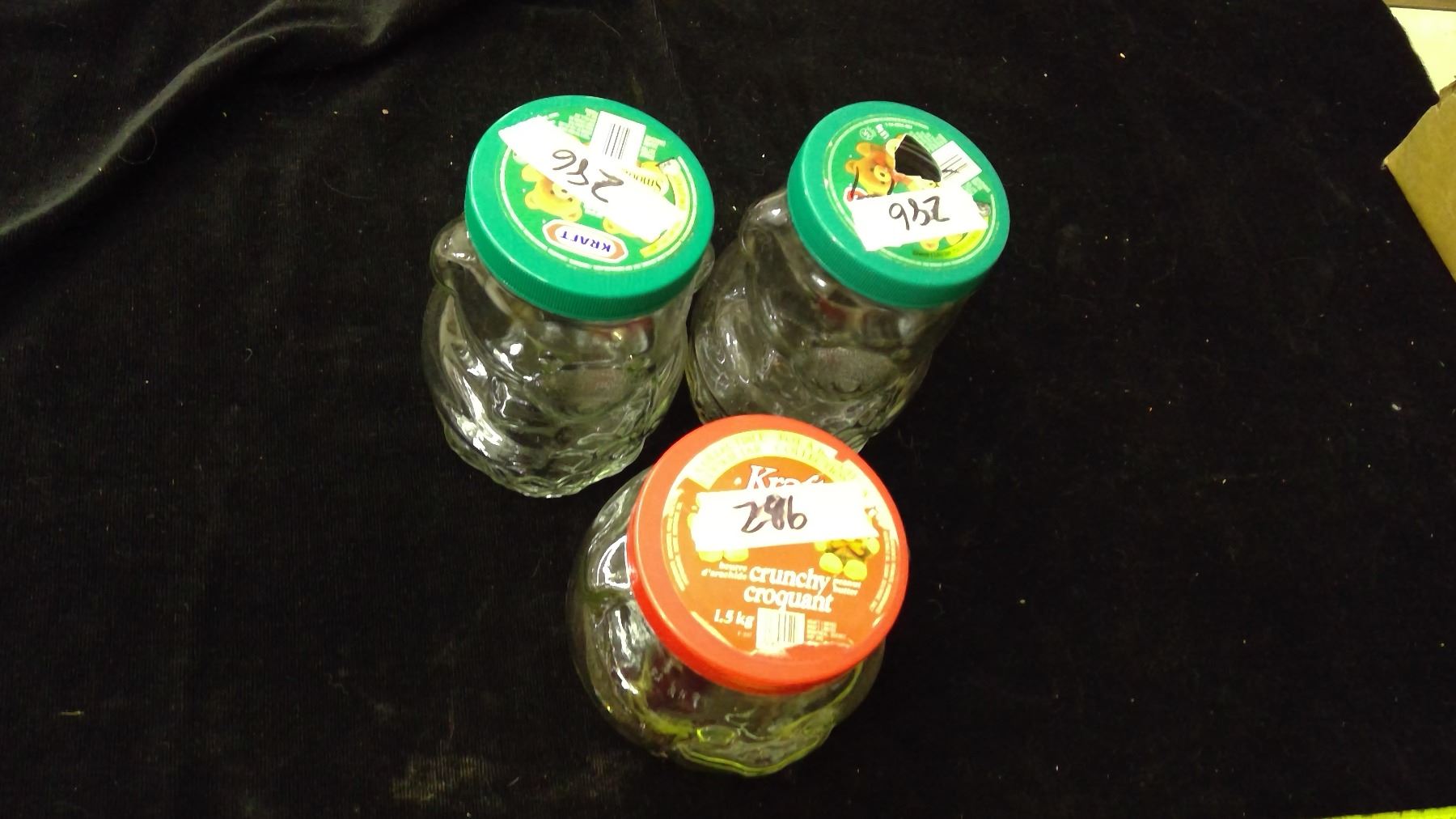 2 Kraft Peanut butter glass jars with lids and smaller Kraft PB jar
