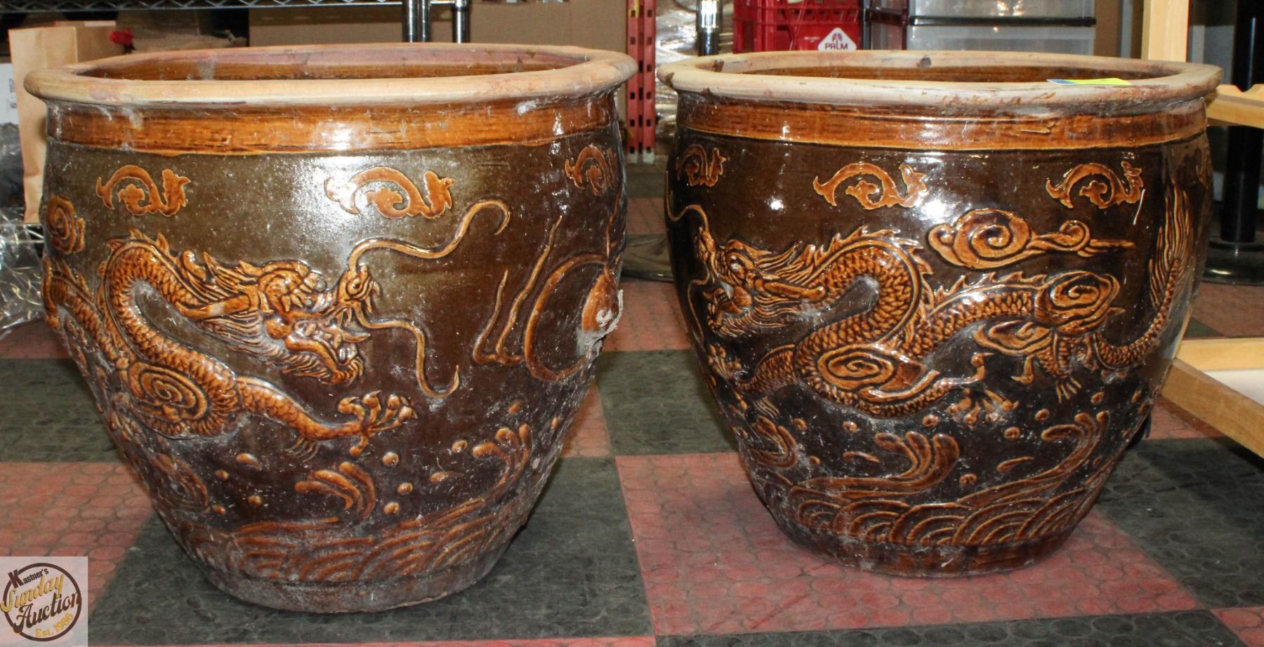 2 LARGE MATCHING DRAGON PLANTERS WITH DRAIN HOLES