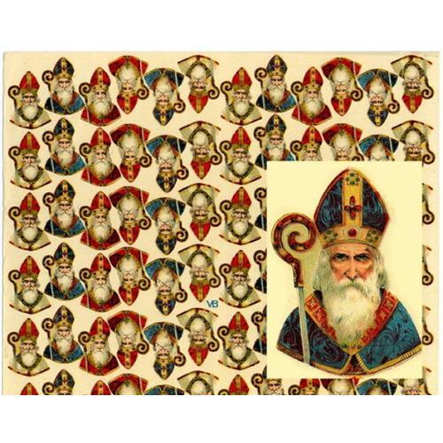2 FULL sheets of rare X-mas paper collectible - large uncut scrap sheets of Saint Nicholas. There are 120 images on each large (15-3/4" x 10-1/2") sheet, each image is 1-3/8" high. There are 3 versions of St. Nicholas - (40) red jeweled hat and white robe, (40) blue jeweled hat and blue robe, (40) red jeweled hat and red robe. Marked VB, number 0100, dated (7th edition) 1940. St. Nicholas Day (December 6th) was very popular Holiday in Europe. On this day small children were visited by the trio of St. Nicholas, Devil and Angel. The Devil reminded them that they should listen to their parents and behave well - otherwise he would take them with him. The Saint Nicholas would then reward the children usually with gingerbread cookies with the St. Nicholas, Devil or Angel scraps pasted on them. This vintage chromolithograph coated with gummastic based laquer survived its 60+ years of age in excellent condition. Please refer to"Christmas Ornaments, Lights & Decorations" by George Johnson, page 104. Listed (1987) value of a comparable swag of 5 is $3-5. Remember, this is sheet of 120!!! Single scraps in this condition is hard to find, full sheets are EXTREMELY scarce!!! Please note that we are picturing only part of the sheet, because it is to large to fit in the scanner. You are buying 2 sheets with total of 240 images !!!!