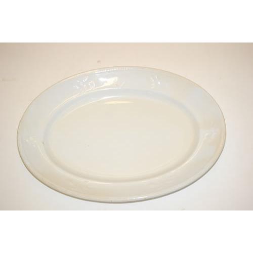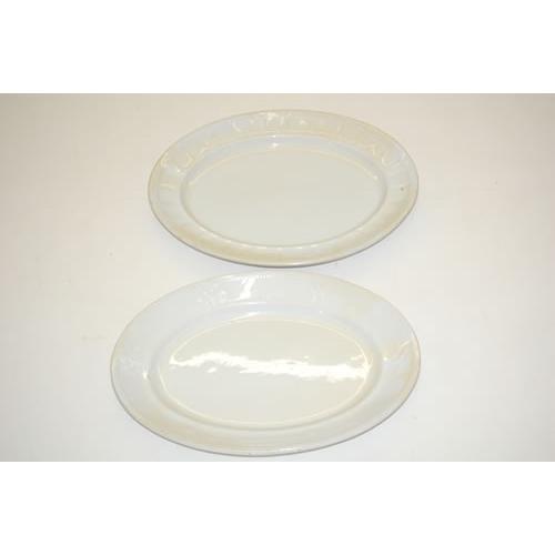 (2) LARGE WHITE IRONSTONE PLATTERS - (1) 18" PLATTER BY JAMES EDWARDS (CRAZING, STAINS, SCRATCHES & WEAR) & (1) 18 1/2" PLATTER W/ ROSE EMBOSSED BORDER IMPRESSED MEAKIN & CO. COBRIDGE (CRAZING, STAINS, SCRATCHES & WEAR)