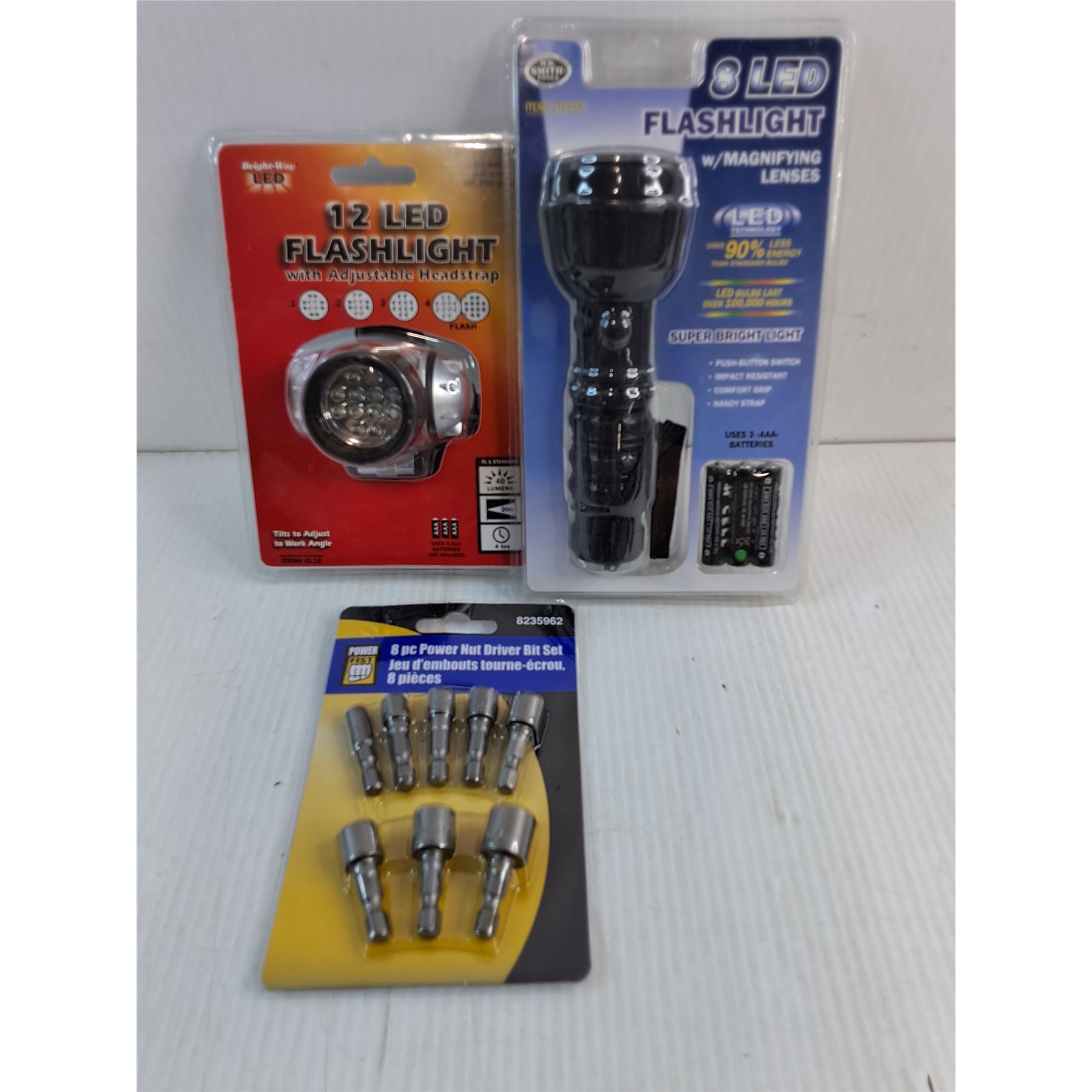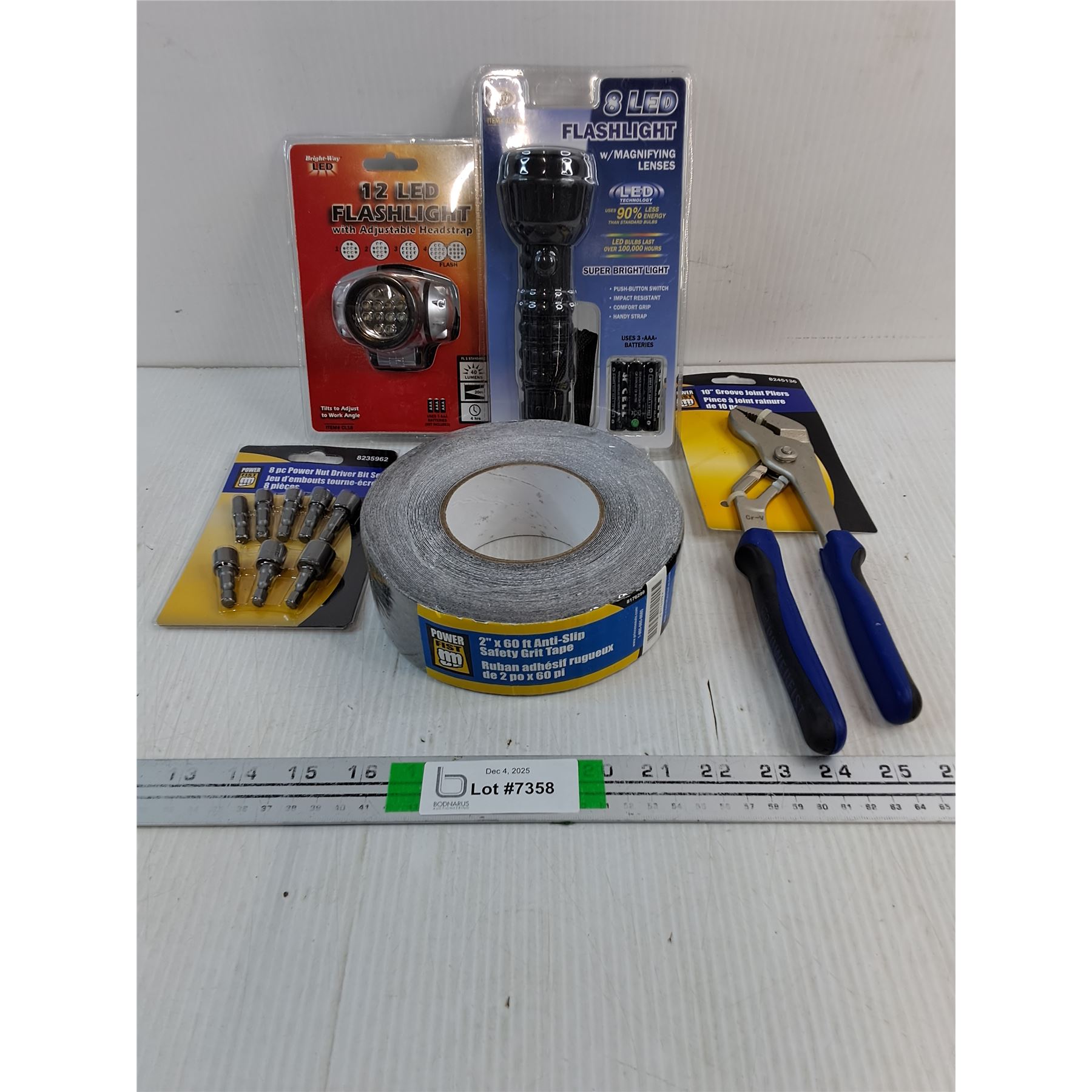 (2) LED Flashlights,10" Groove Joint Pliers,Anti-Slip Tape,Power Nut Driver Bit Set