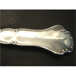 2 LARGE STERLING SERVING SPOONS. Marked "Sterling" on reverse of handle and etched "1911". Monogrammed on front of handle "S".