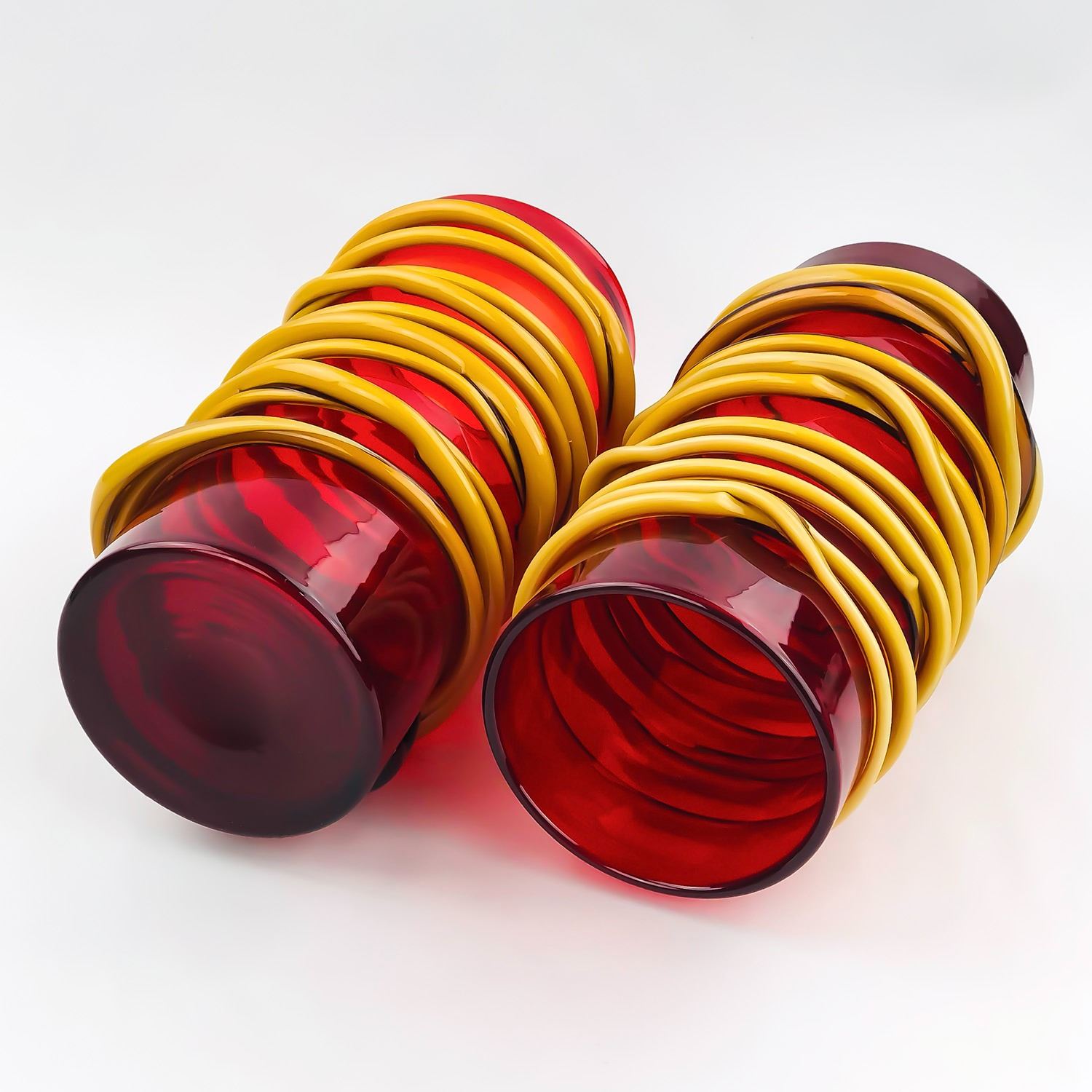 #9081 - INTERESTING STYLISH ART GLASS VASES, UNKNOWN MAKER, THE WALLS OF THE VASES ARE ROUGHLY 1/4” THICK, YELLOW NEON LOOKING SPIRALS ARE RANDOMLY DESIGNED AROUND EACH VASE, THEY MEASURE 11.75” (30 CM) TALL BY 5.25” (13.5 CM) TOPDIAMETER. THE TOP D***ITEM(S) LOCATED IN LETHBRIDGE ALBERTA. ALL ITEMS IN THIS AUCTION QUALIFY FOR OUR FREE TRANSPORT TO EDMONTON SERVICE. WORLDWIDE SHIPPING AVAILABLE