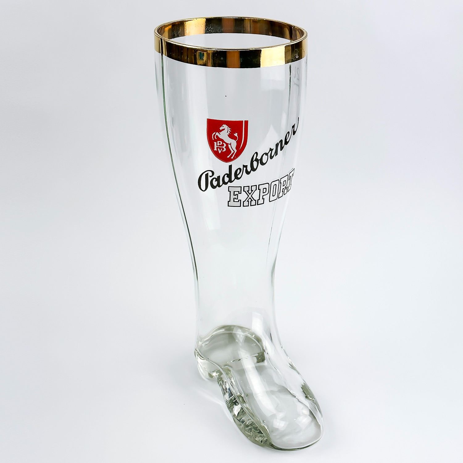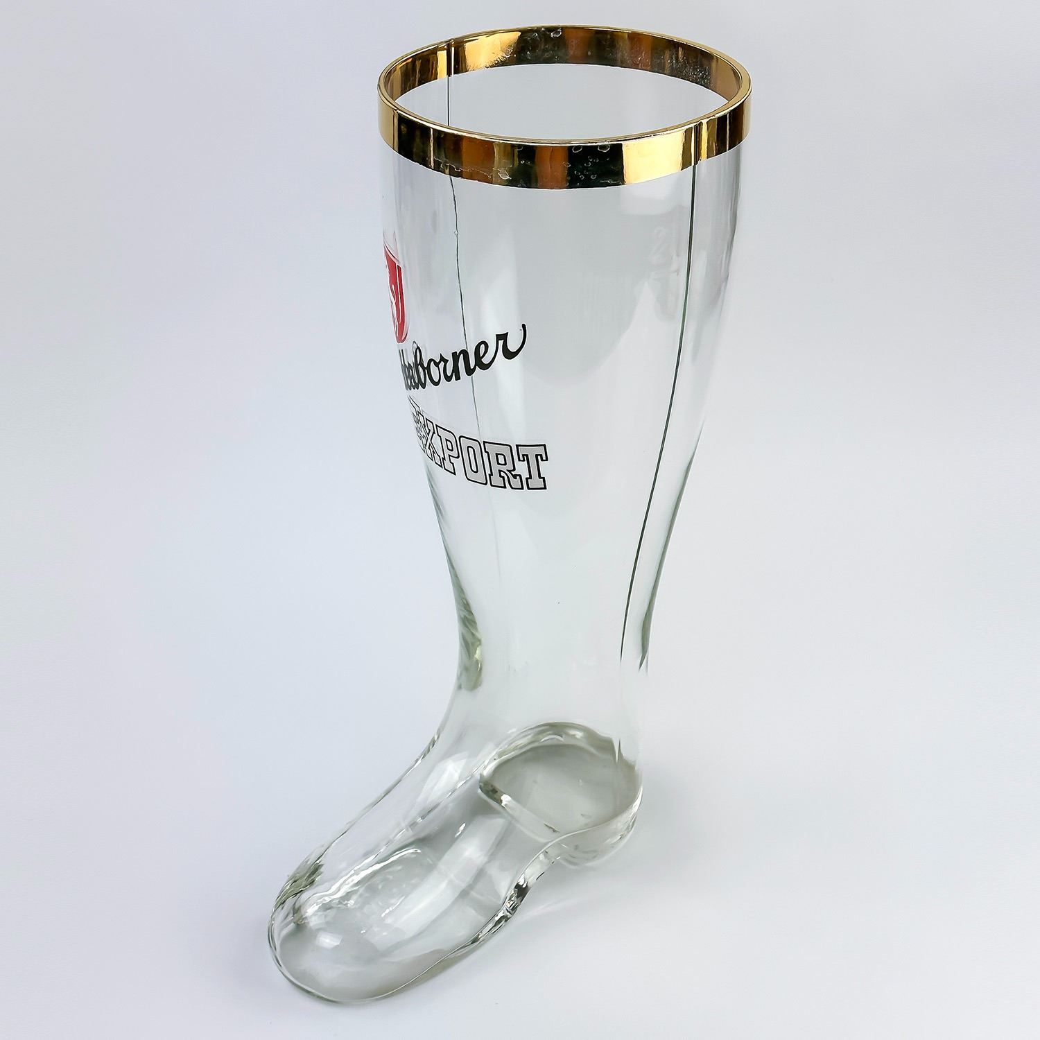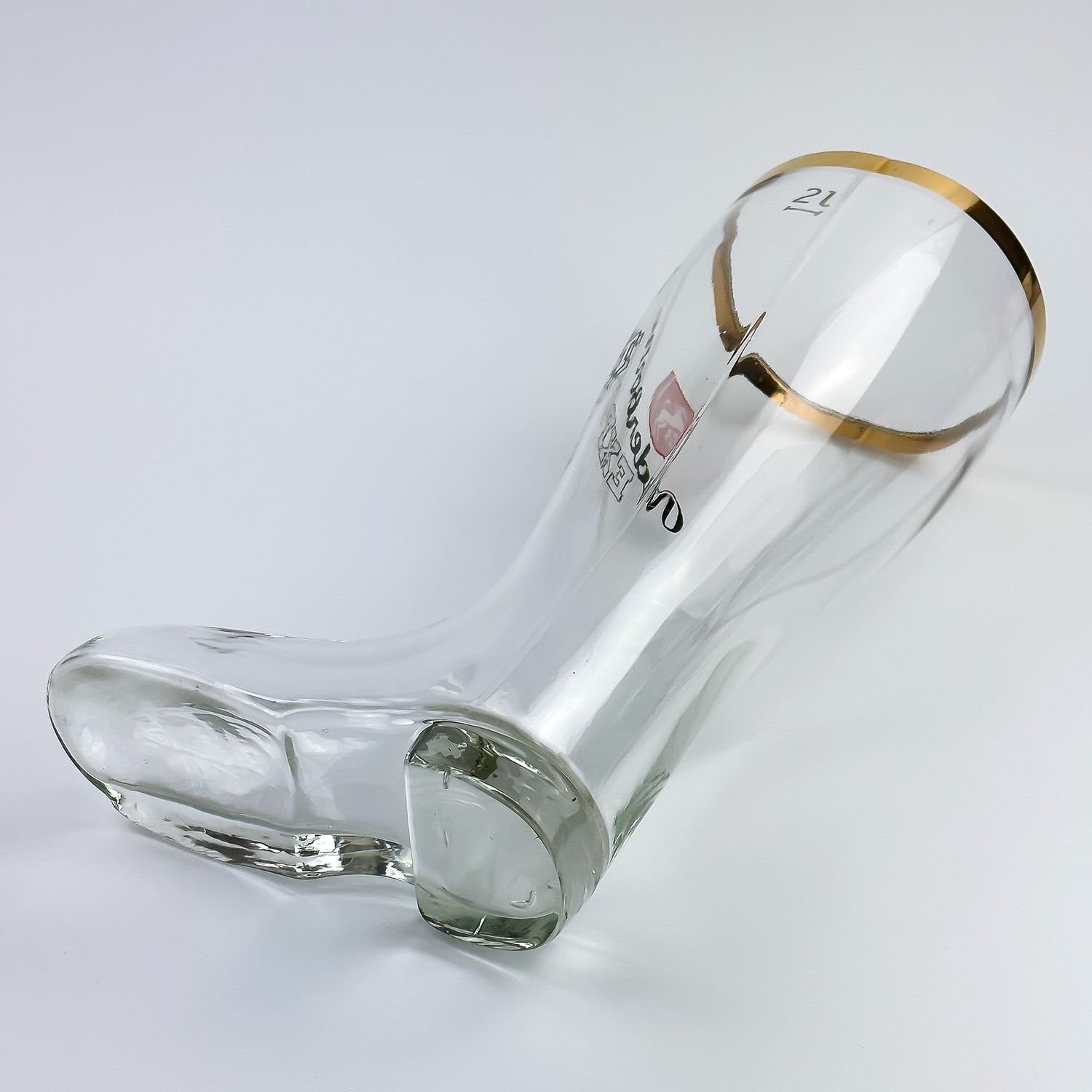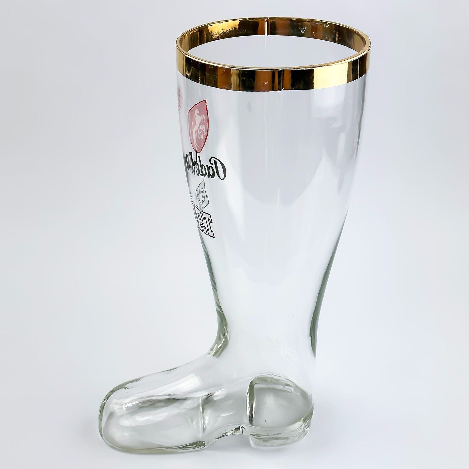 #8019 - LARGE GLASS BOOT WITH GOLD TRIM - BAR DECOR GLASS. MEASURES: 13” (33 CM) TALL BY 7.125” (18 CM) WIDE BOOT BASE AND 5.125” (13 CM) TOP DIAMETER