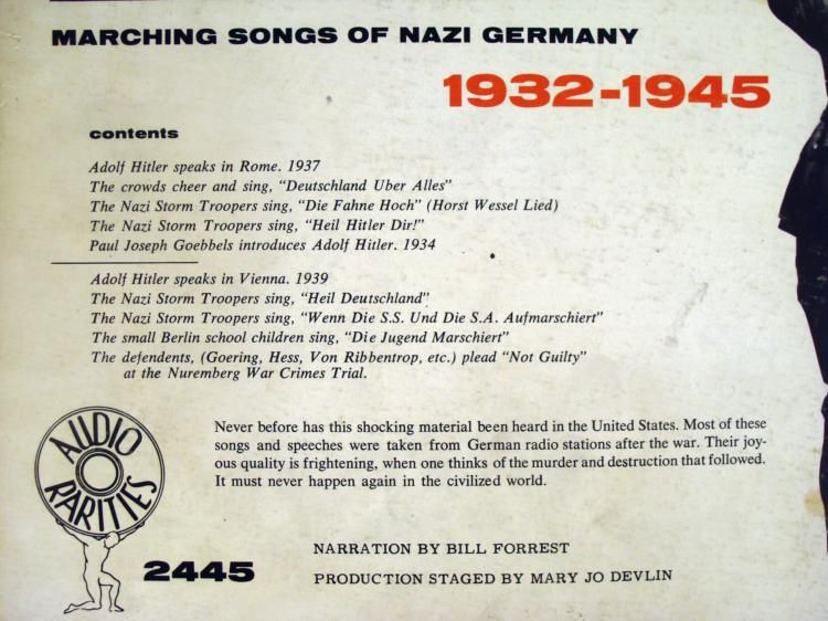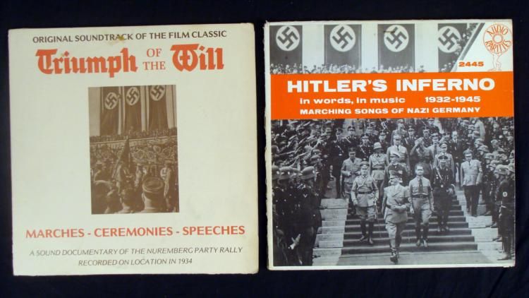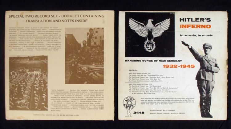 OFFERED HERE ARE 2 LP'S, "TRIUMPH OF THE WILL SOUNDTRACK" & "HITLER'S INFERNO". THE RECORDS CONTAIN SPEECHES BY HITLER AND OTHERS, AS WELL AS NAZI SONGS. "TRIUMPH OF THE WILL" IS A SOUND DOCUMENTARY OF THE NUREMBERG PARTY RALLY RECORDED ON LOCATION IN 1934 AND IS FROM UNITED ARTIST RECORDS. "HITLER'S INFERNO" WERE MARCHING SONGS OF NAZI GERMANY FROM 1932-1945 AND IS FROM AUDIO PARTIES RECORDS. BOTH ARE USED AND UNTESTED AND ARE IN GOOD CONDITION. * * * *