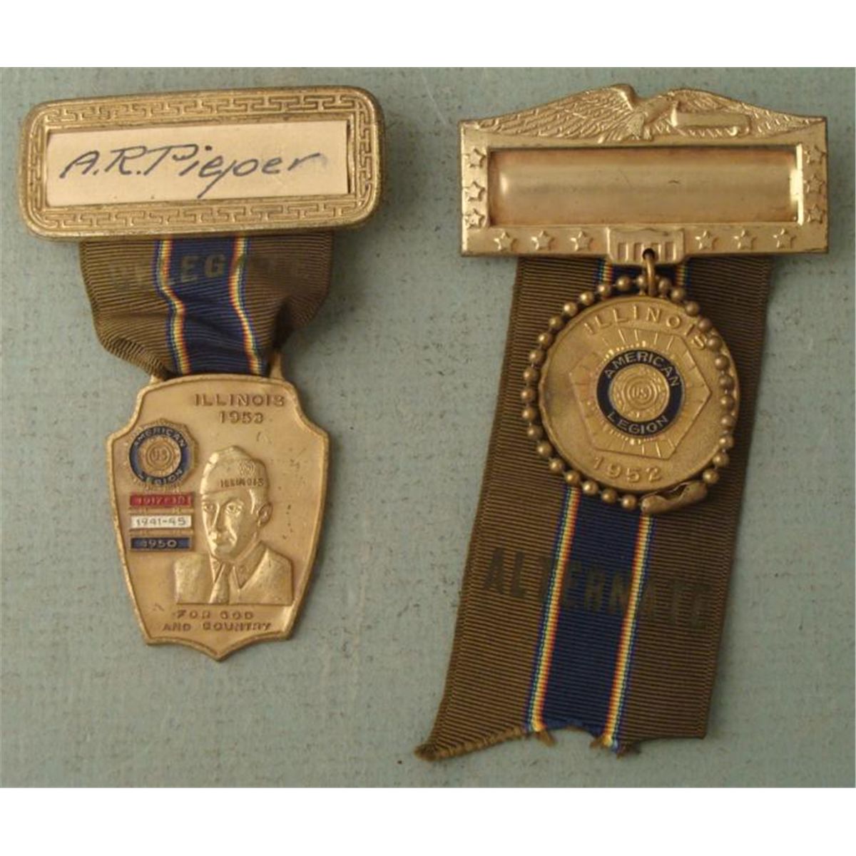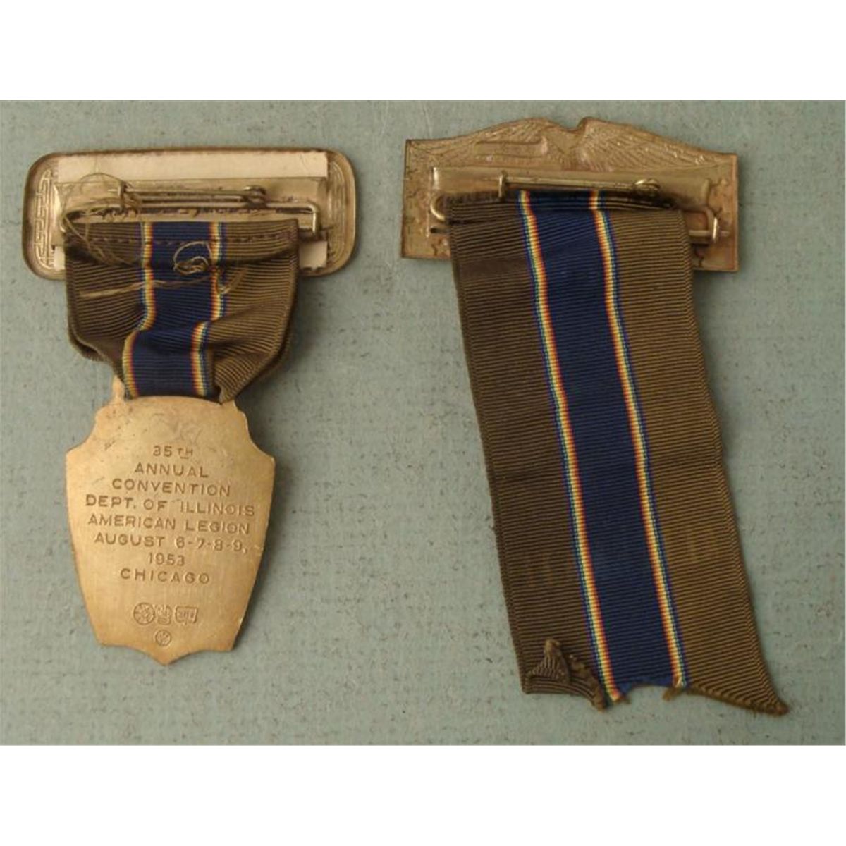 2 LT COMMANDERS AMERICAN LEGION CONVENTION BADGES ONE IS FROM 1952, ILLINOIS & THE OTHER IS A 1953 DELAGATE ILLINOIS BADGE. * THE 1952 MEDAL HAS A ORNATE EAGLE TOP BAR AND ON THE REVERSE IT READS: 34TH ANNUAL CONVENTION DEPT. OF ILLINOIS AMERICAN LEGION, JULY 31-AUGUST 3, 1952, CHICAGO. THE 1953 MEDAL IS NAMED & ON THE REVERSE IT SAYS: 35TH ANNUAL CONVENTION CONVENTION DEPT. OF ILLINOIS AMERICAN LEGION, AUGUST 6-9. 1953, CHICAGO. *