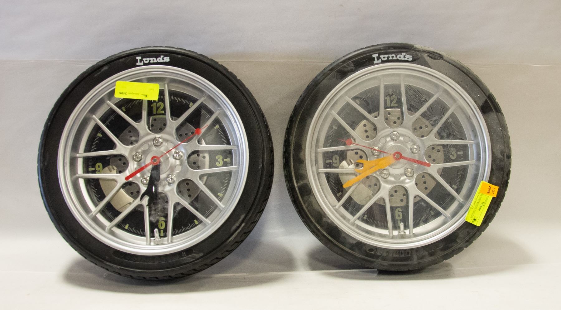 2 LUND'S TIRE/WHEEL CLOCKS APPROX 16" DIAMETER