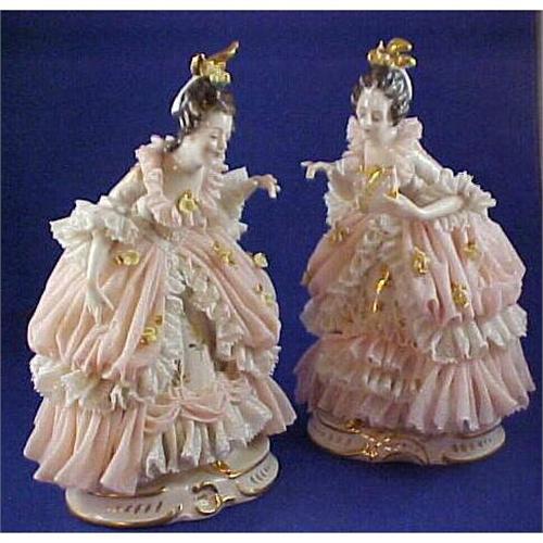 This is a pair of exquisite 7.5" tall porcelain figurines. They have the most wonderfully extravagant lace dresses and lovely facial details. They are in great condition with a tiny bit of lace missing and a small crack on the back on one of them. They are marked as shown,
