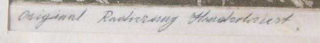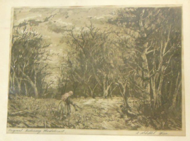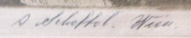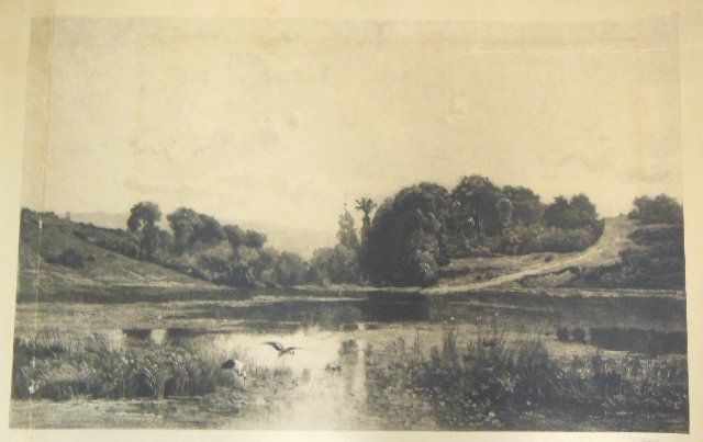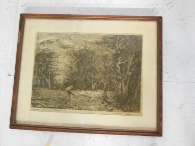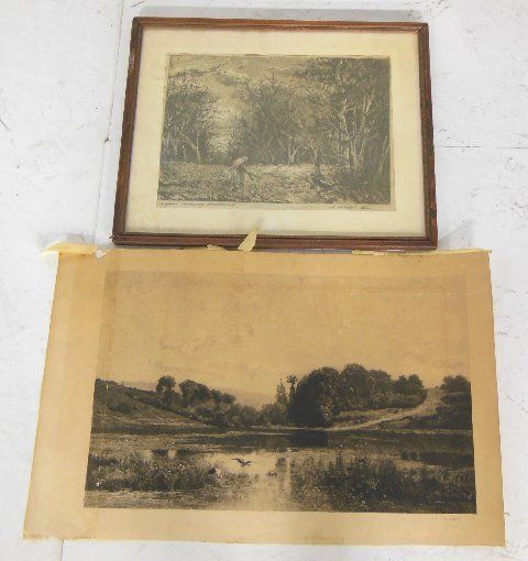 1- Etching signed Y. Chamy, unframed approx. 18" x 28". 1- "Landscape" etched on silk, signed A. Sicheffel, framed approx. 17" x 21".