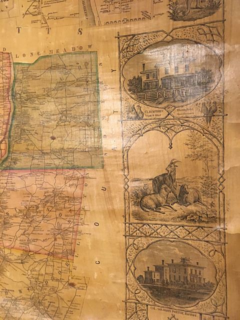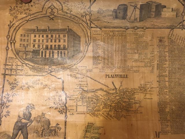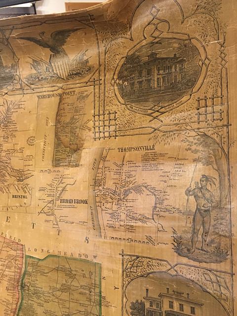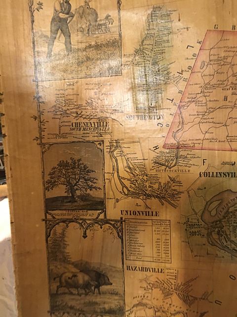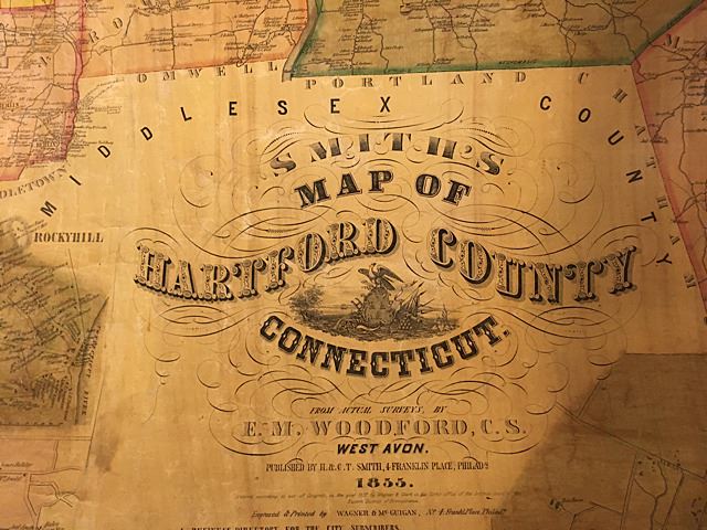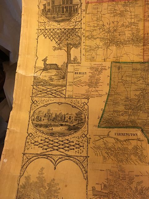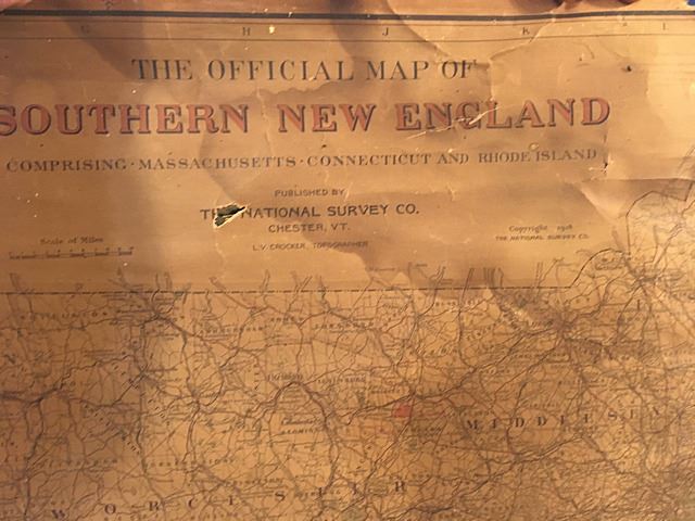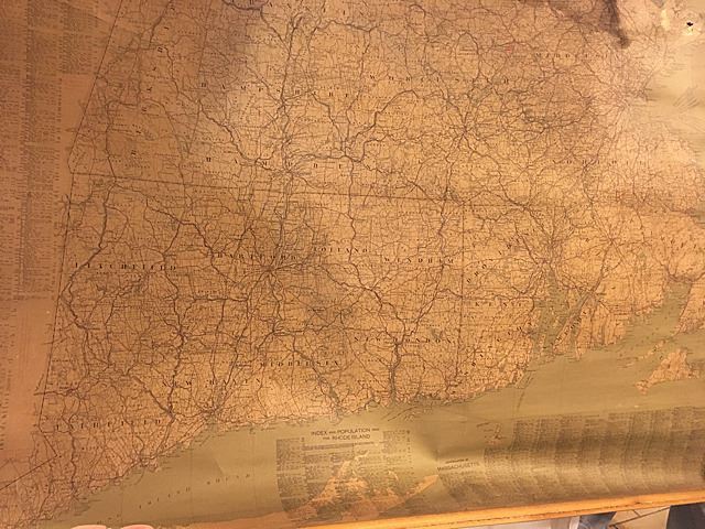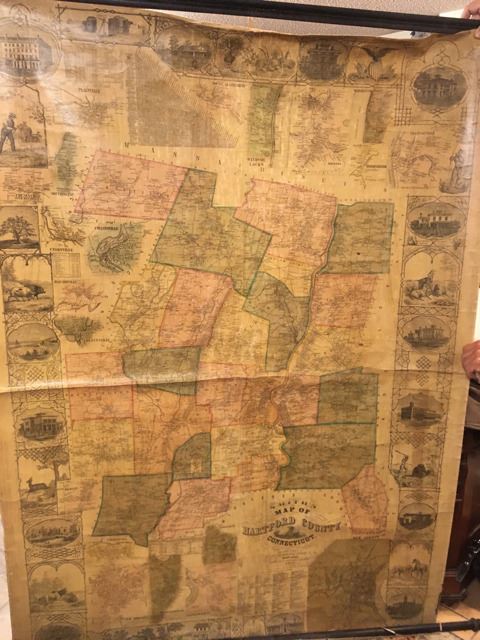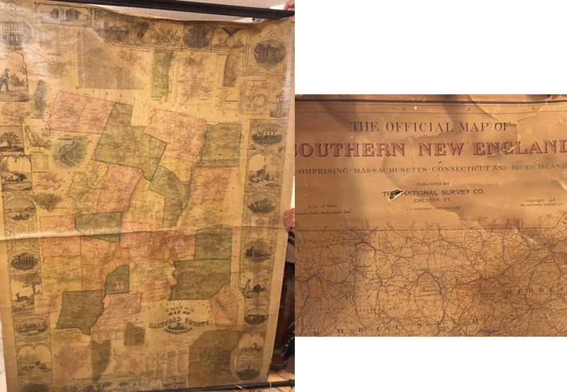 2 Large Antique Maps, one wall sized map is a beautiful map by Smith's of Hartford County Connecticut, fram actual surveys by E. M. Woodford, C.S. West Avon, 1855, with beautiful depictions down the side of architectural and scenes from the area. The other map is the Official Map of Southern New England Comprising Massachuesetts, Connecticut and Rhode Island, published by The National Survey Co., Chester, VT,