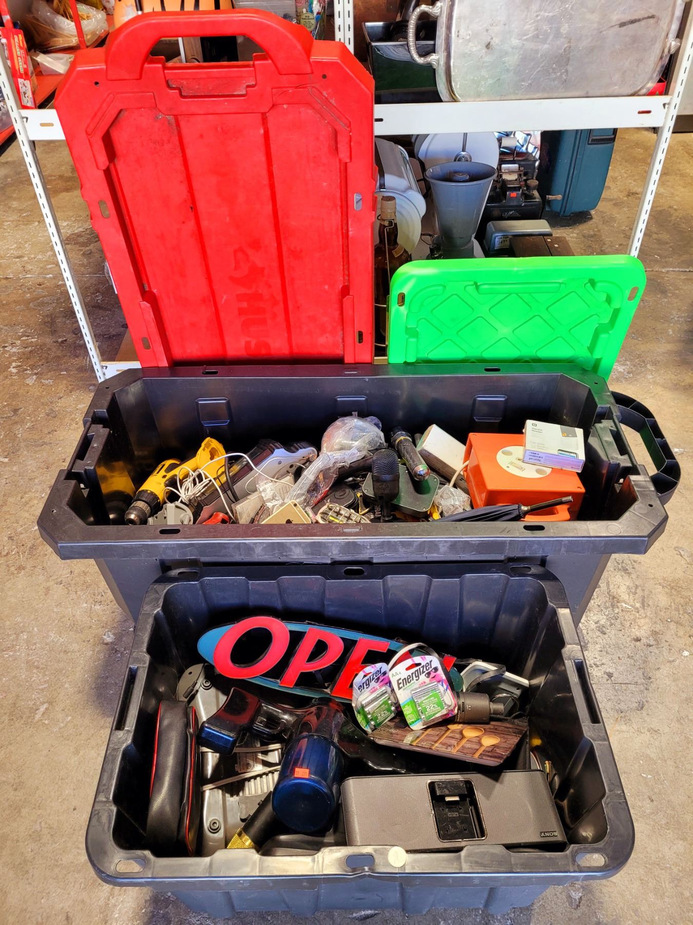 2 Large Bins of Mixed Electronics w/ Open Sign, Energizer Batteries, Microphone, & More