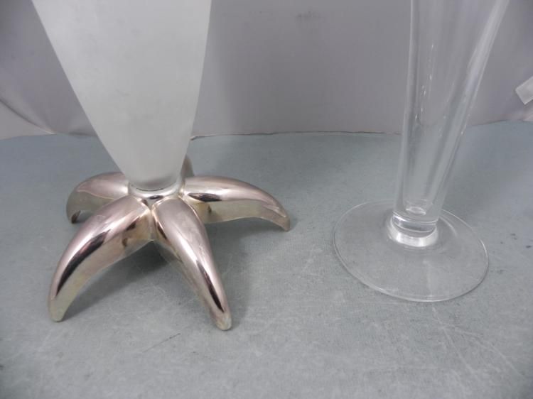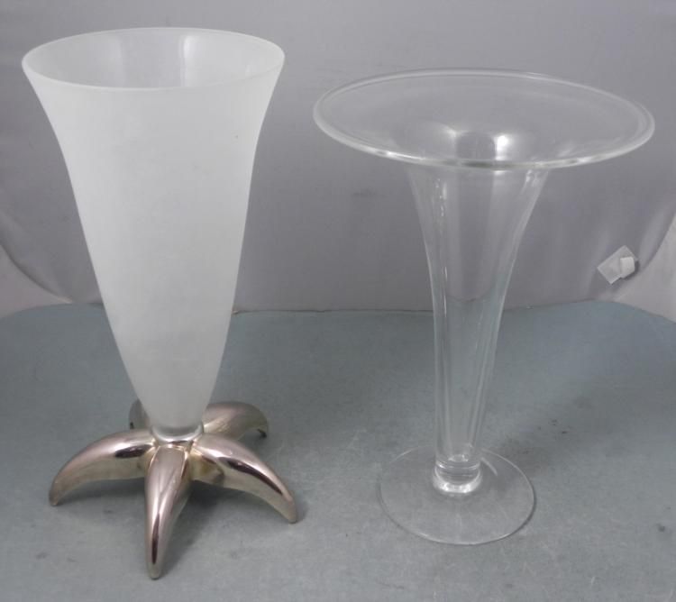 Here are two large glass vases. One is clear crystal with a wide opening, standing 13" tall and 9" in diameter. The other is frosted glass with silver tone metal starfish base, and it is 14 1/2" tall, and 8" at the base. They are in excellent condition, and the frosted surface has some scuff marks. * * These vases will add elegance to table centerpiece.