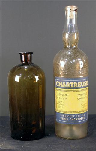 2 Large Display Bottles: 1 Amber unmarked 16" tall, 1 "Chartreuse" Liquor 24" tall