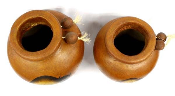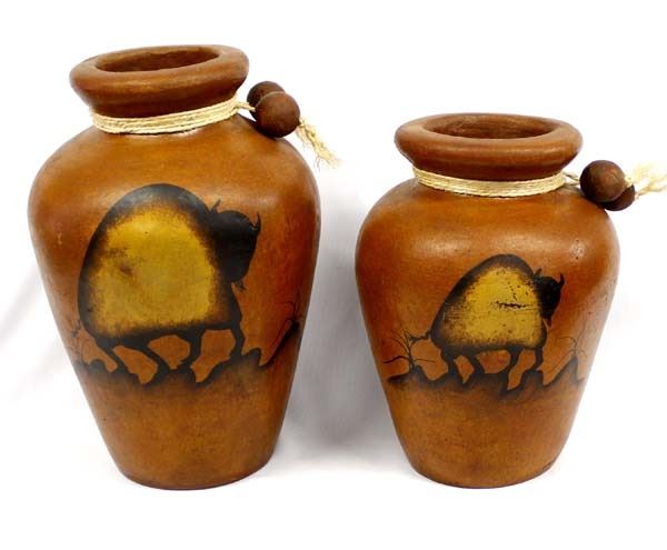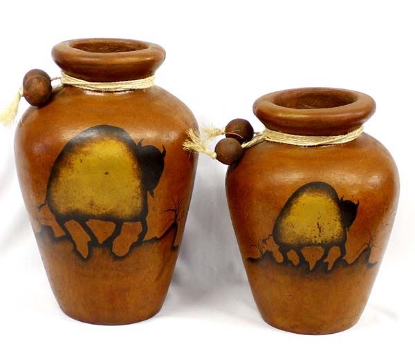 2 Large Painted Pottery Vases, Must Be Picked Up, largest measures 15'' x 9'', buffalo motif, embellished with jute around rims and 2 pottery spheres on each pot