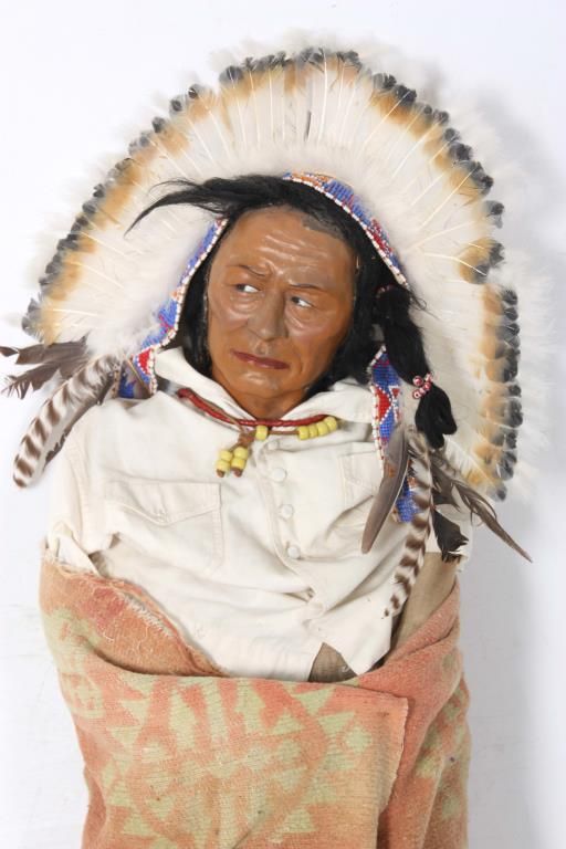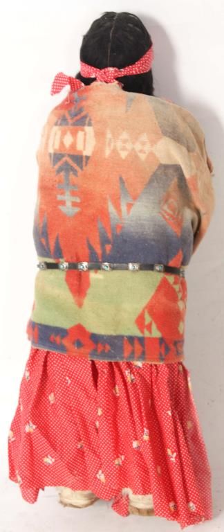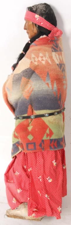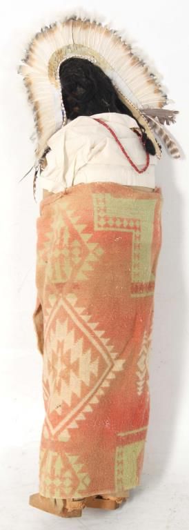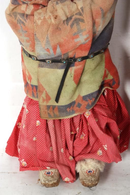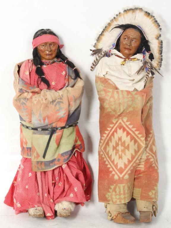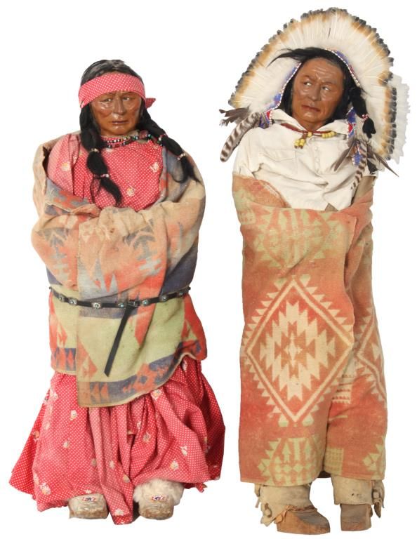 2 Large Skookum Dolls. Male & female figures, one standing 32 in. high and the other standing 34 in. high; both have painted faces and mohair wigs with burlap bodies stuffed with straw, the legs are wood dowels and carved wood feet. The figures wear head pieces, have bodies wrapped in a native type blanket, one with moccasins and both with beaded jewelry.