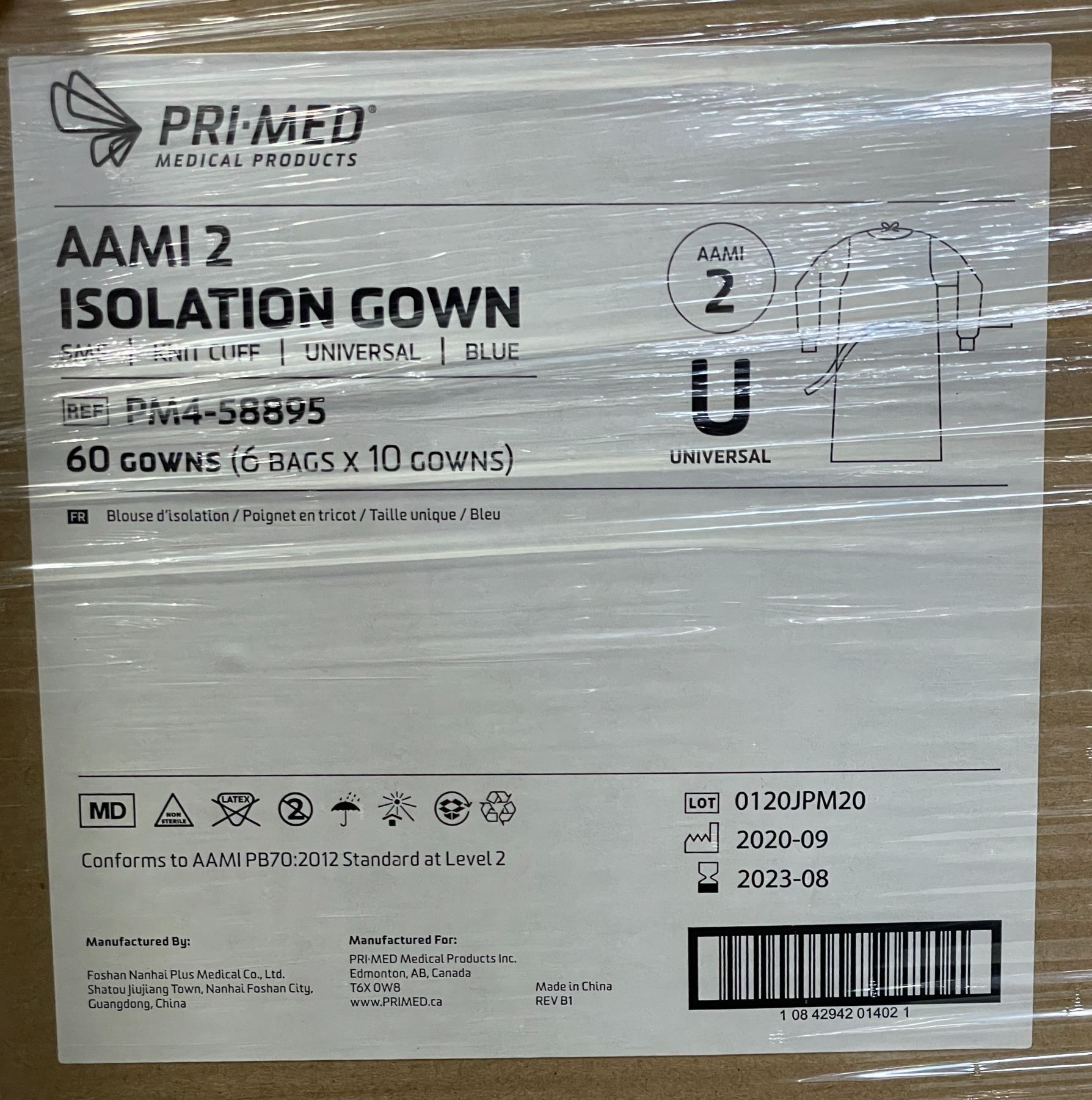 2 Large pallet of PRI-MED AAMI 2 universal blue isolation gown PM4-58895 approx. 60 gowns (6 bags x 10 gowns | approx. 30 boxes per pallet) Please note: Expiry dates may differ across lots