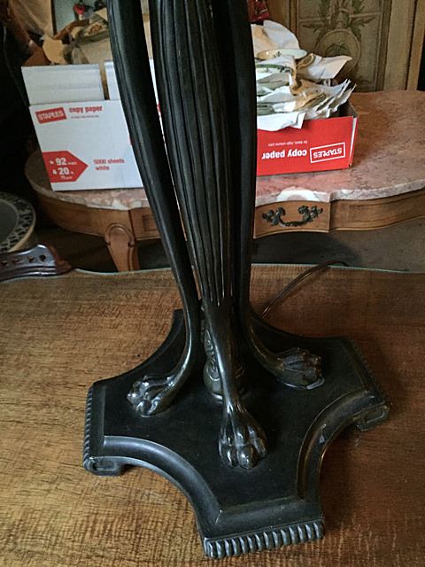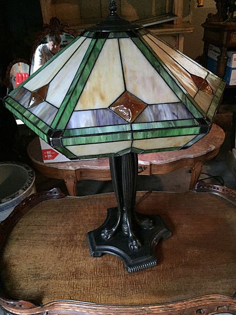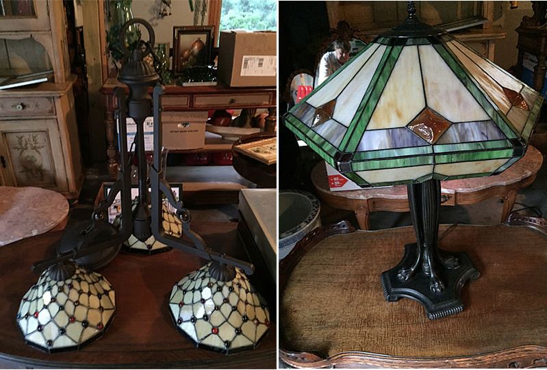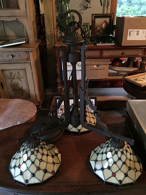 2 decorative reproduction leaded lamps. 1 is hanging lamp with 3 globes, 1 is table lamp