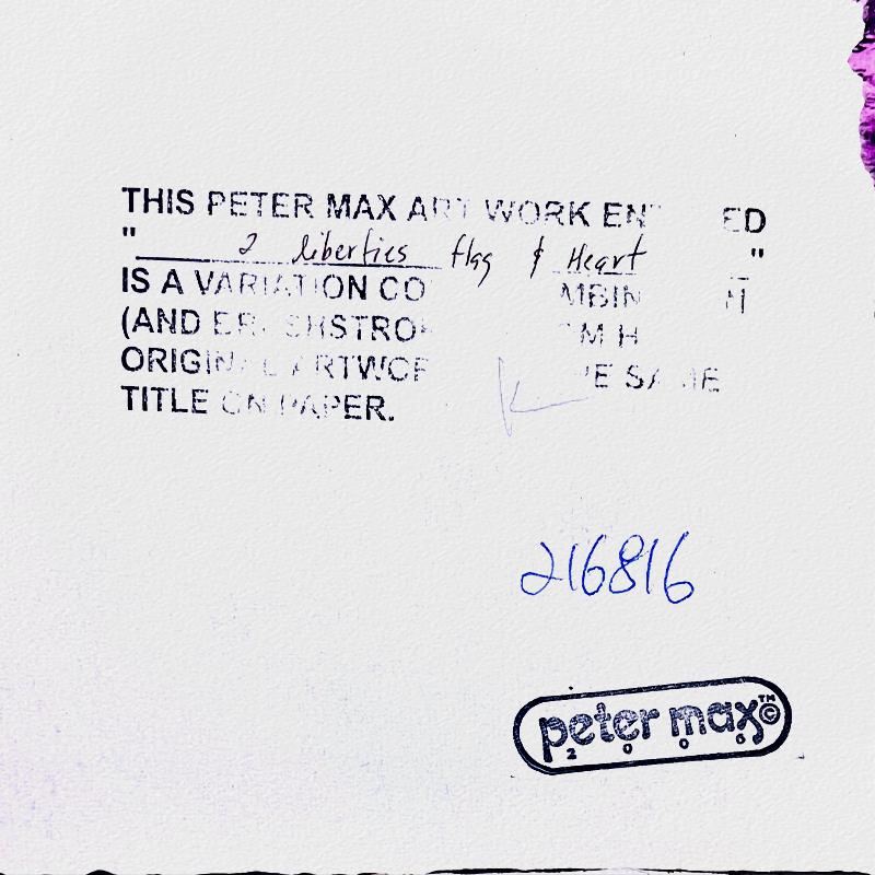 "2 Liberties, Flag and Heart" is a one-of-a-kind mixed media on paper, hand signed by Peter Max. The piece comes custom framed with a backside cutout to display Peter Max Studio registration number 216816 certifying authenticity. Measures approximately 28" x 24" (frame), 19" x 15" (image).