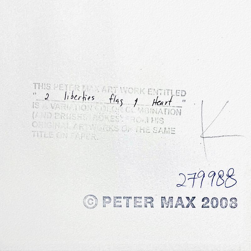 "2 Liberties, Flag and Heart" is a one-of-a-kind mixed media on paper, hand signed by Peter Max. The piece comes custom framed with a backside cutout to display Peter Max Studio registration number 279988 certifying authenticity. Measures approximately 28" x 24" (frame), 19" x 15" (image). This item requires special handling and may have a longer than usual turnaround.