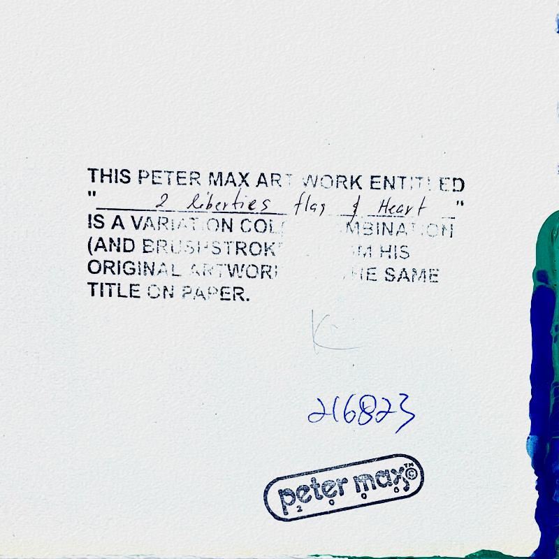 "2 Liberties, Flag and Heart" is a one-of-a-kind mixed media on paper, hand signed by Peter Max. The piece comes custom framed with a backside cutout to display Peter Max Studio registration number 216823 certifying authenticity. Measures approximately 28" x 24" (frame), 19" x 15" (image). This item requires special handling and may have a longer than usual turnaround.
