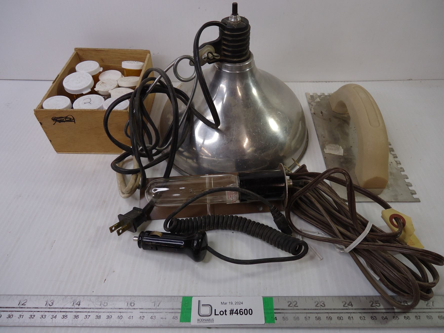 (2) Lights, Trowel, Car Lighter Cord, Box of Assorted Hardware
