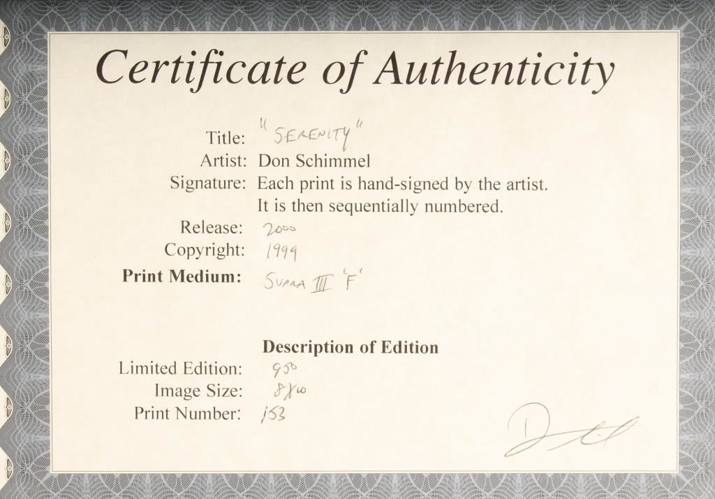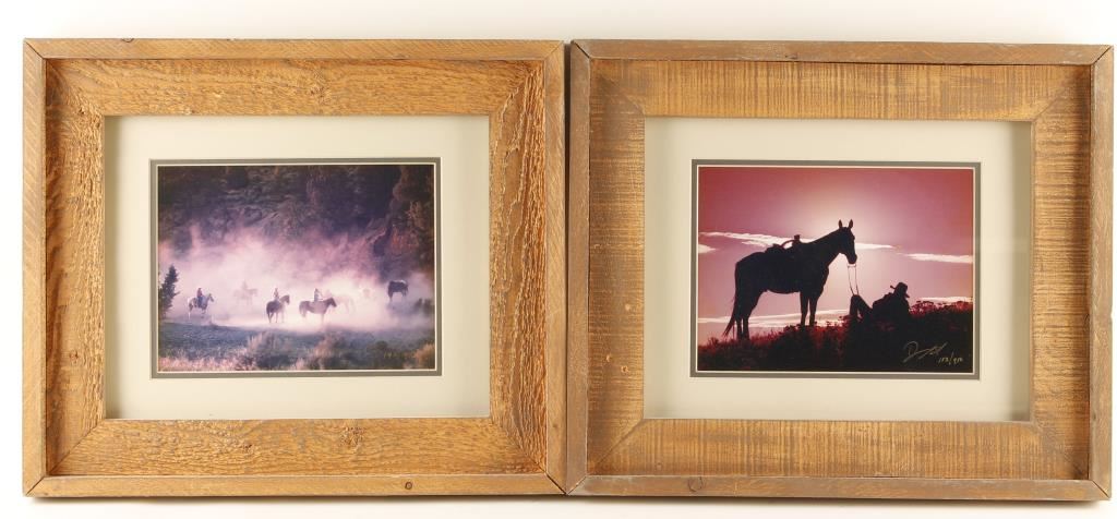 Both by Donald Schimmel, signed and numbered with certificates of authenticity. 1) "Dusty Canyon" 195/950, depicts cowboys in canyon herding horses. 2) "Serenity" 153/950, depicts cowboy in silhouette with horse in front of sunset. Both have double mats with rustic wood frames and images measure 9 3/4"x7 1/4".