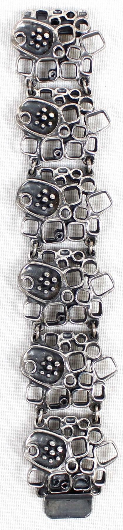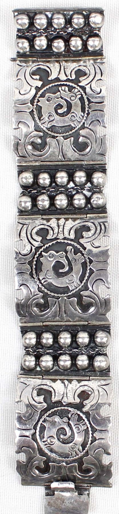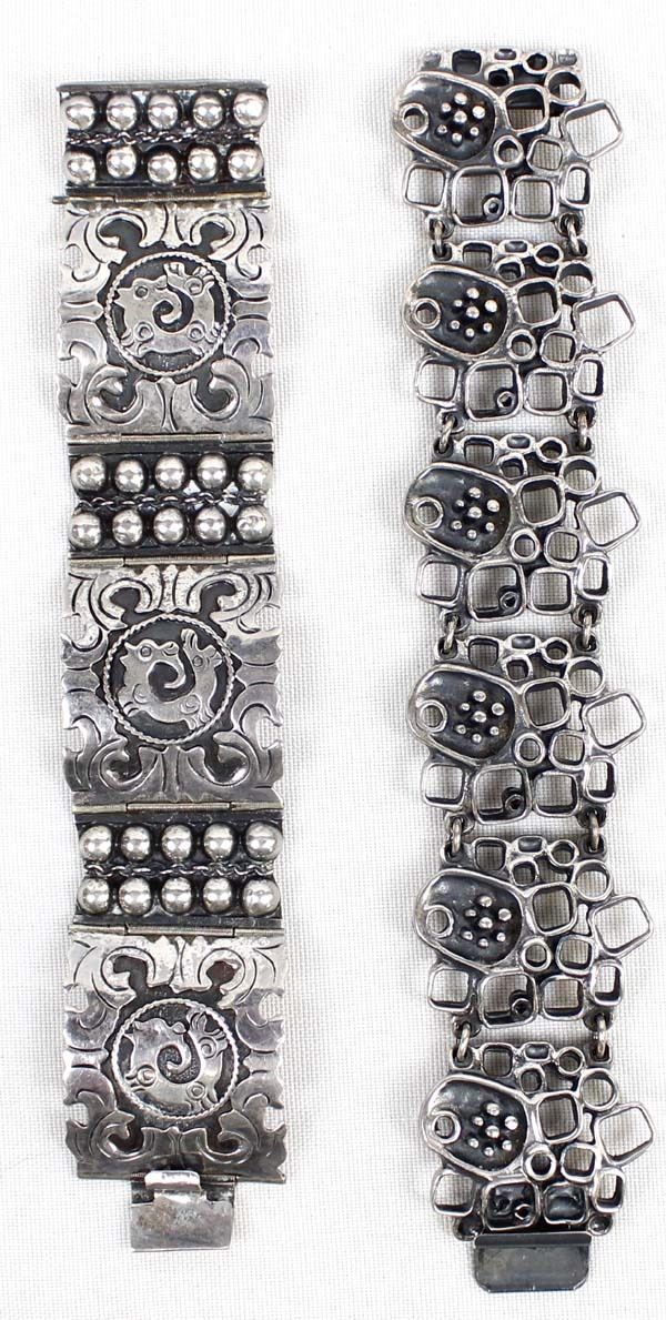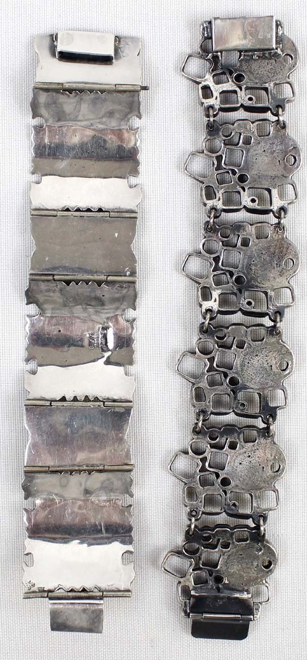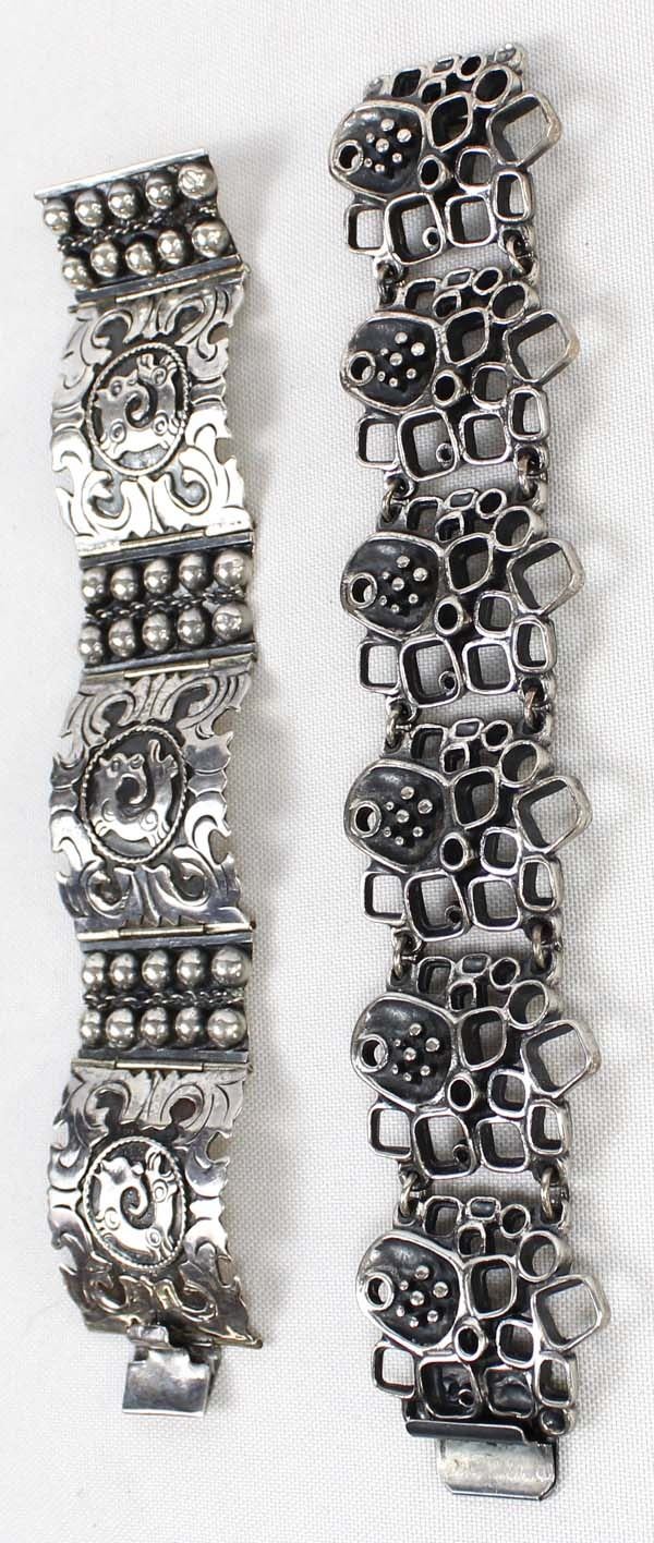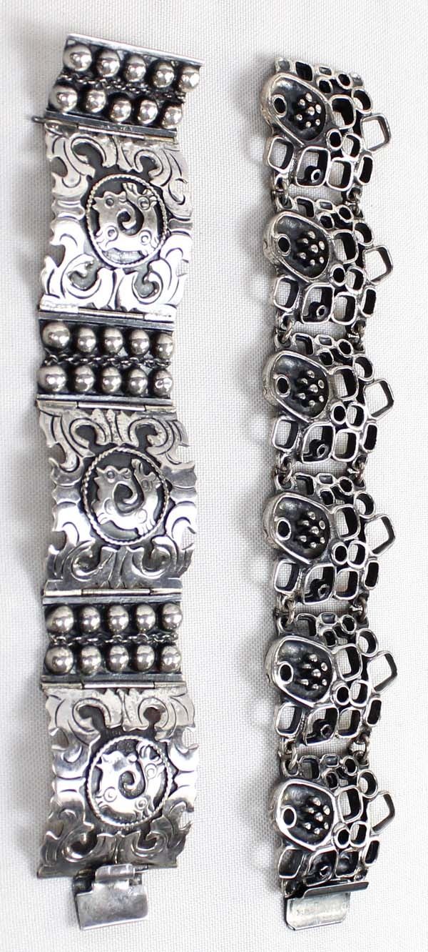 2 Link Bracelets, 1 is Marked .925, the one with small flowers on it is unmarked and measures 7.25''L x 1 3/8''W, the double headed mythical creature bracelet is hallmarked (unreadable) and stamped .925 and measures 6.75''L x 1 3/8''W