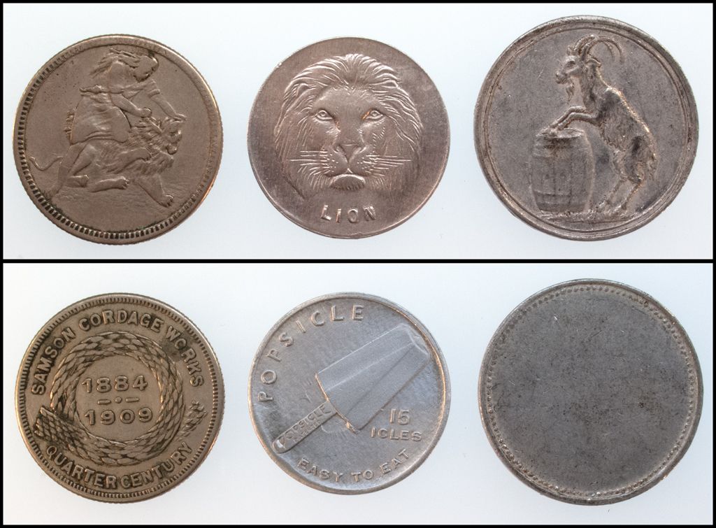 Lot of 3 Pictorial Storecards- Popsicle w Lion on reverse (aluminium) / SAMSON CORDAGE WORKS w man & lion on reverse 1884-1909 / Goat and Barrell (aluminium)