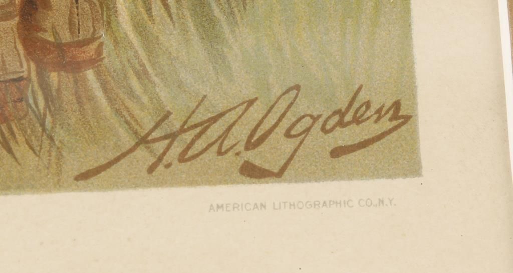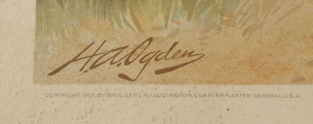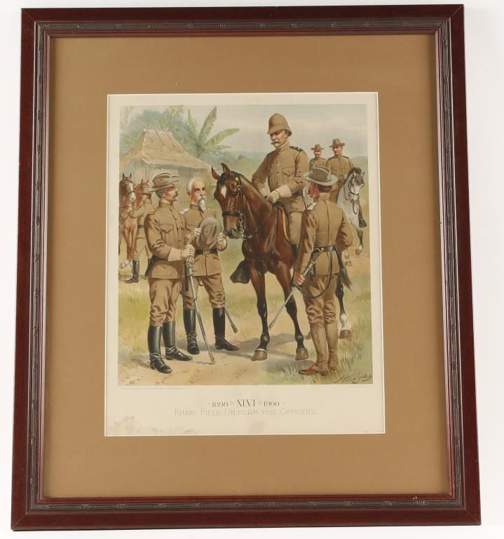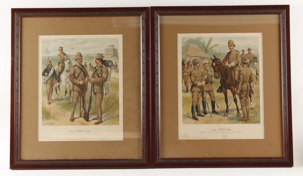 Both depicting British horse soldiers. Dated 1898-1900. Shows some water damage. Was an advertisement for officers field uniforms. Image size12-1/2" wide x 15" high. Framed.