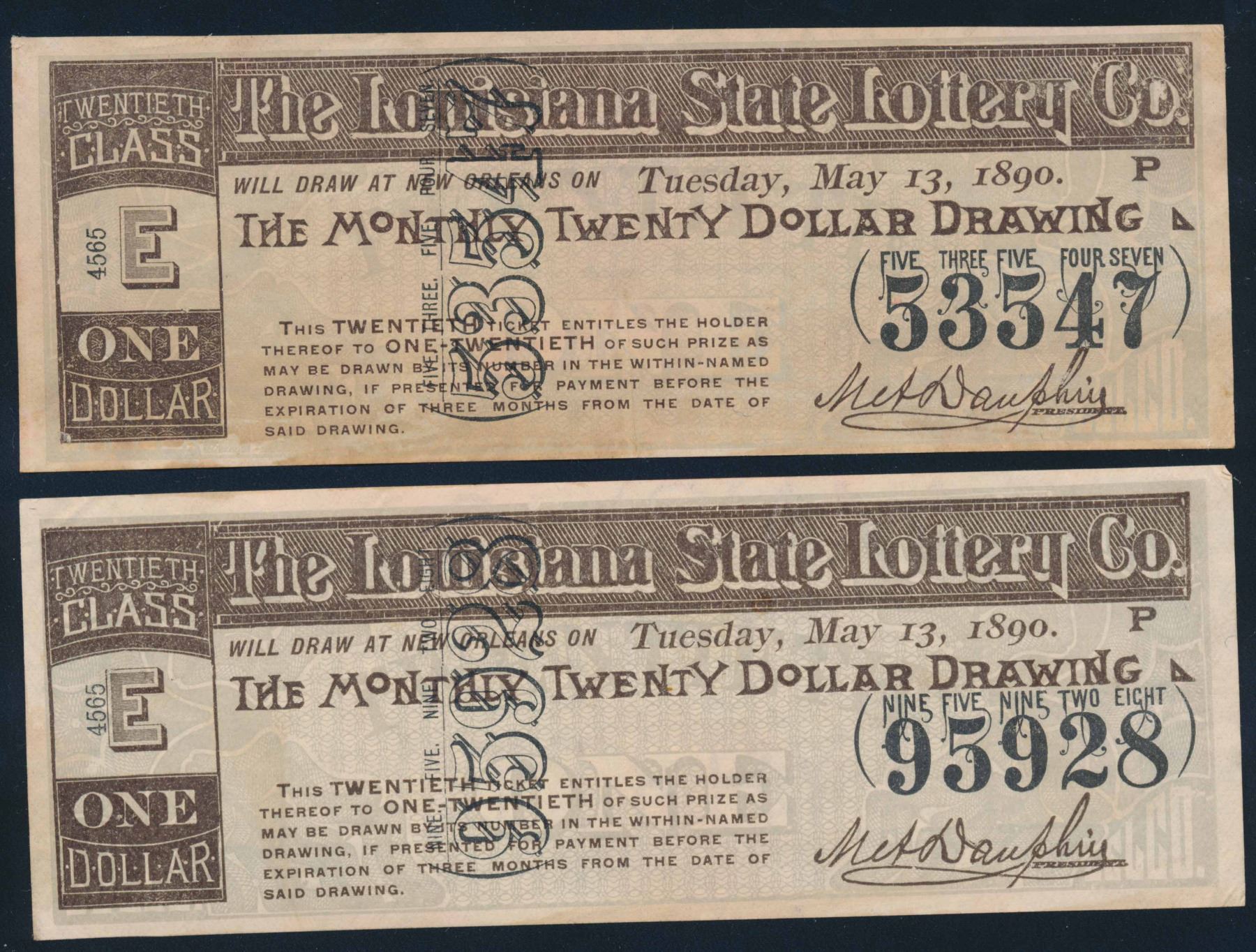 2- Louisiana State Lottery Co, One Dollar Lottery Tickets 1890 Twentieth Class E