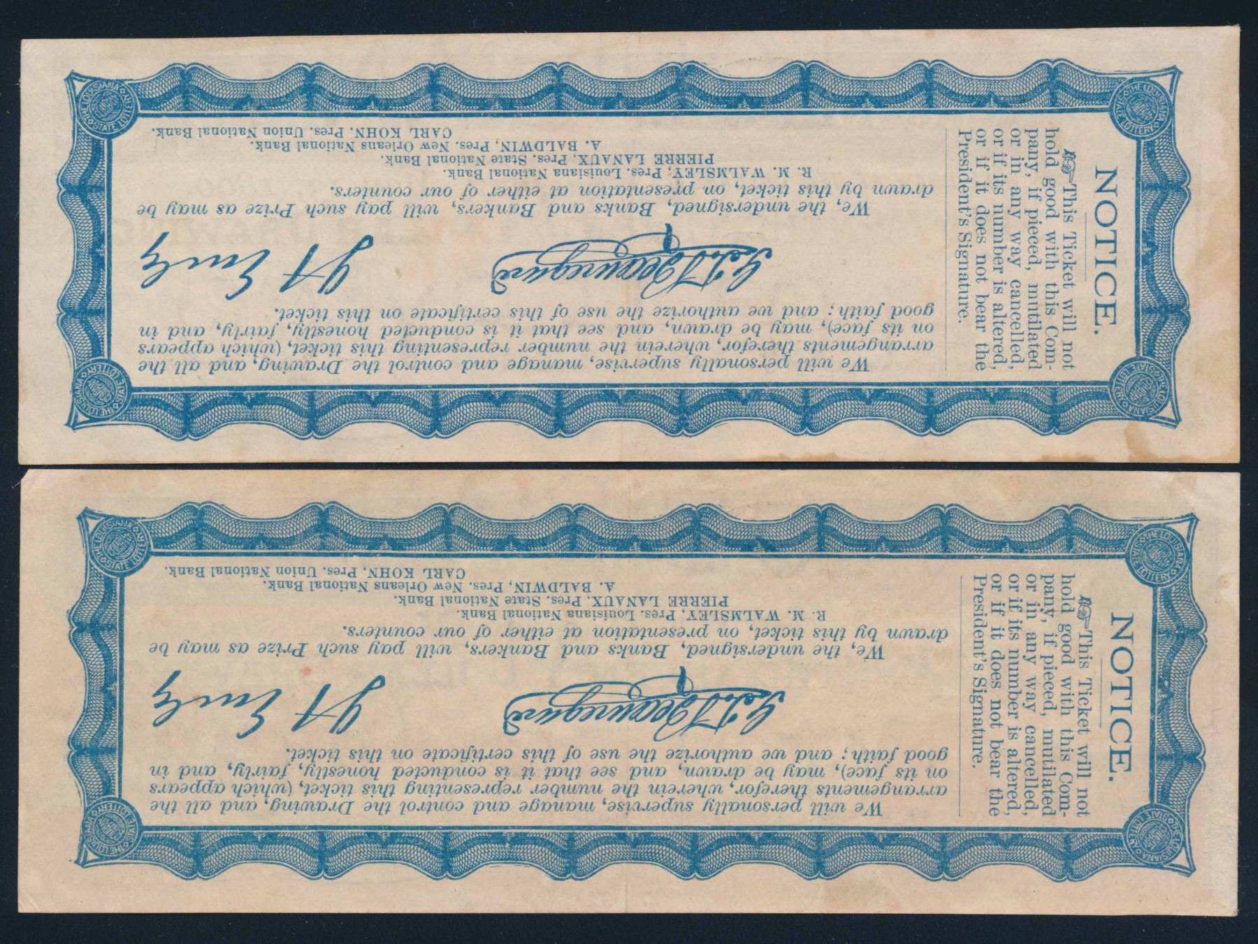 Both tickets for the same drawing of May 13, 1890. One copy is a bright AU, the other a decent EF, with a little reverse staining.